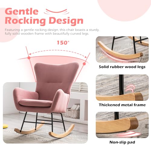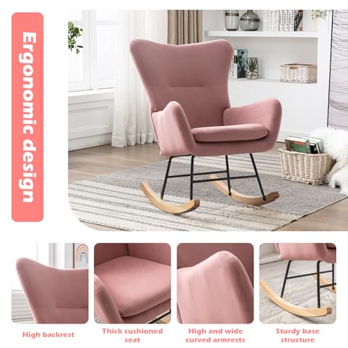 Rocking Chair Nursery Upholstered Accent Chair with High Backrest Solid Wood Legs Comfortable Glider Chair Stylish Reading Chair for Living Room, Nursery, Bedroom Rocking Chair Indoor (1, Pink)