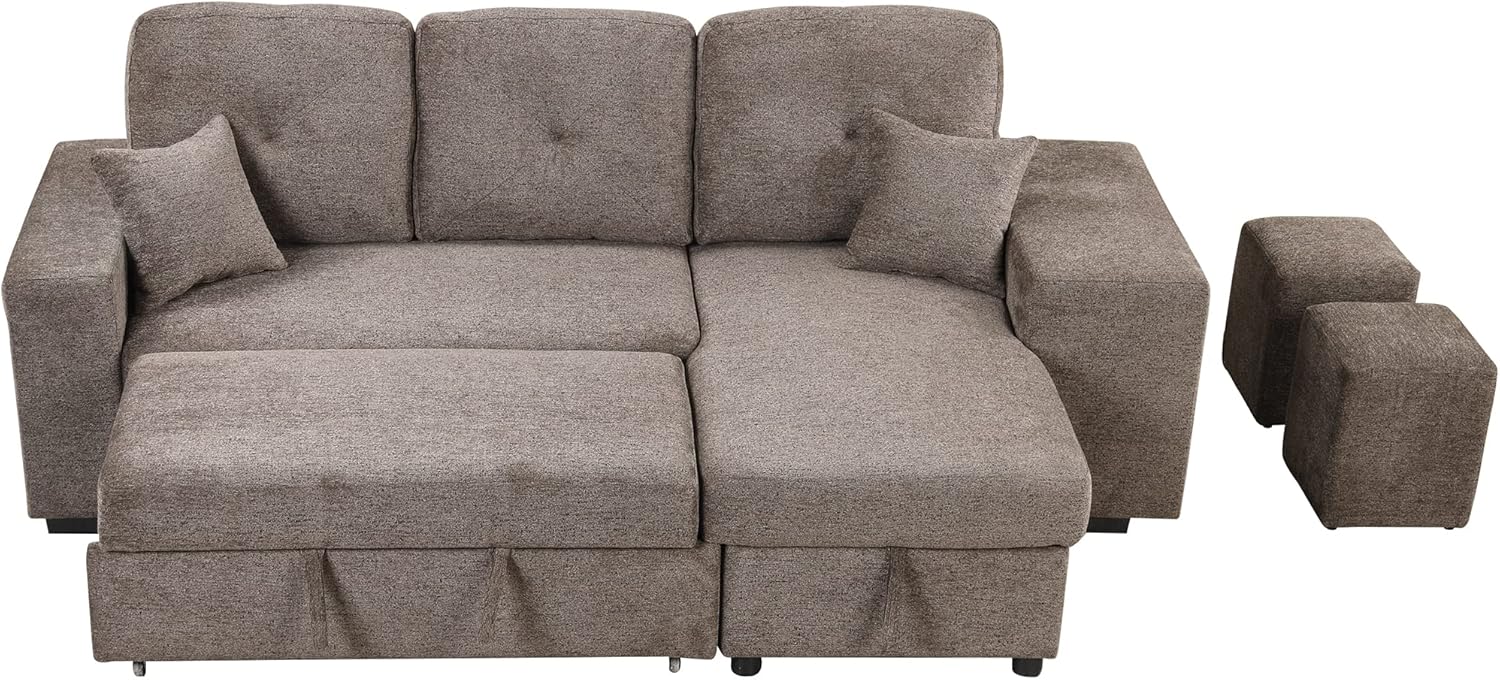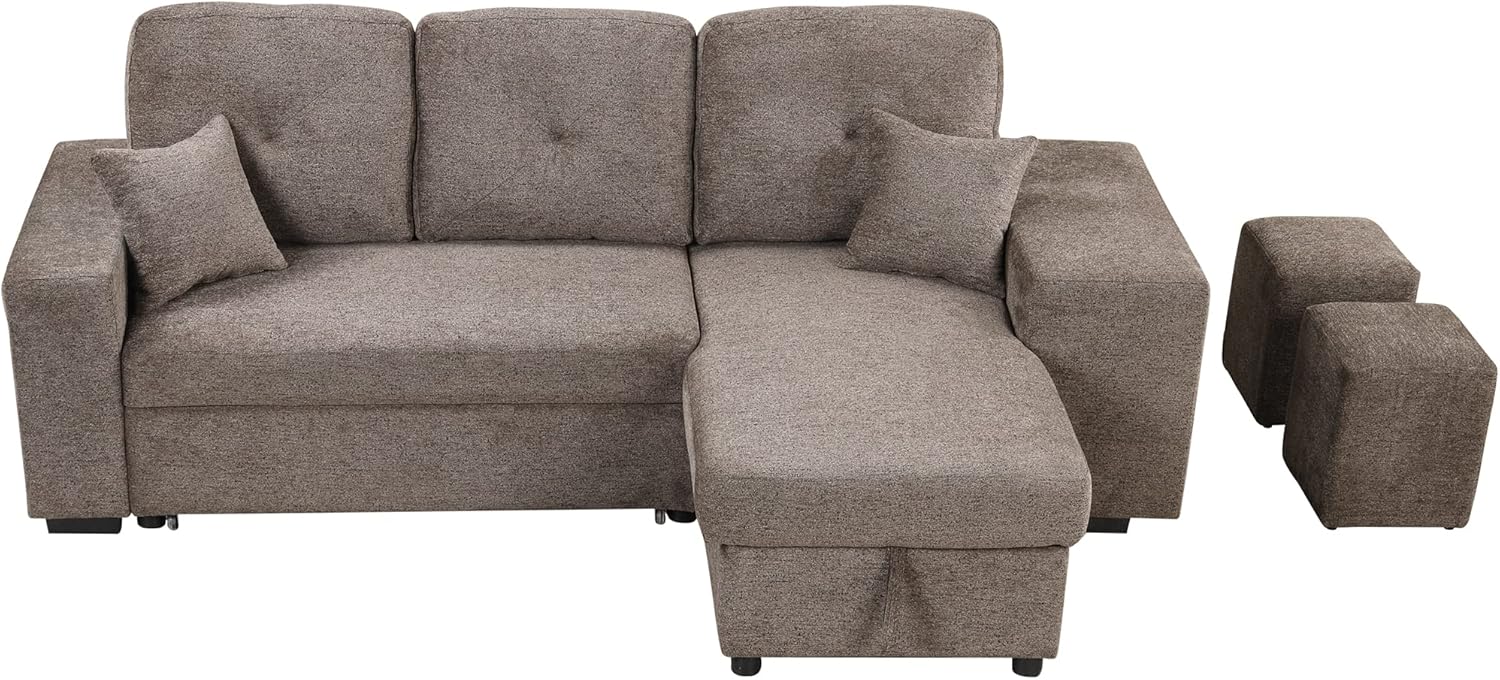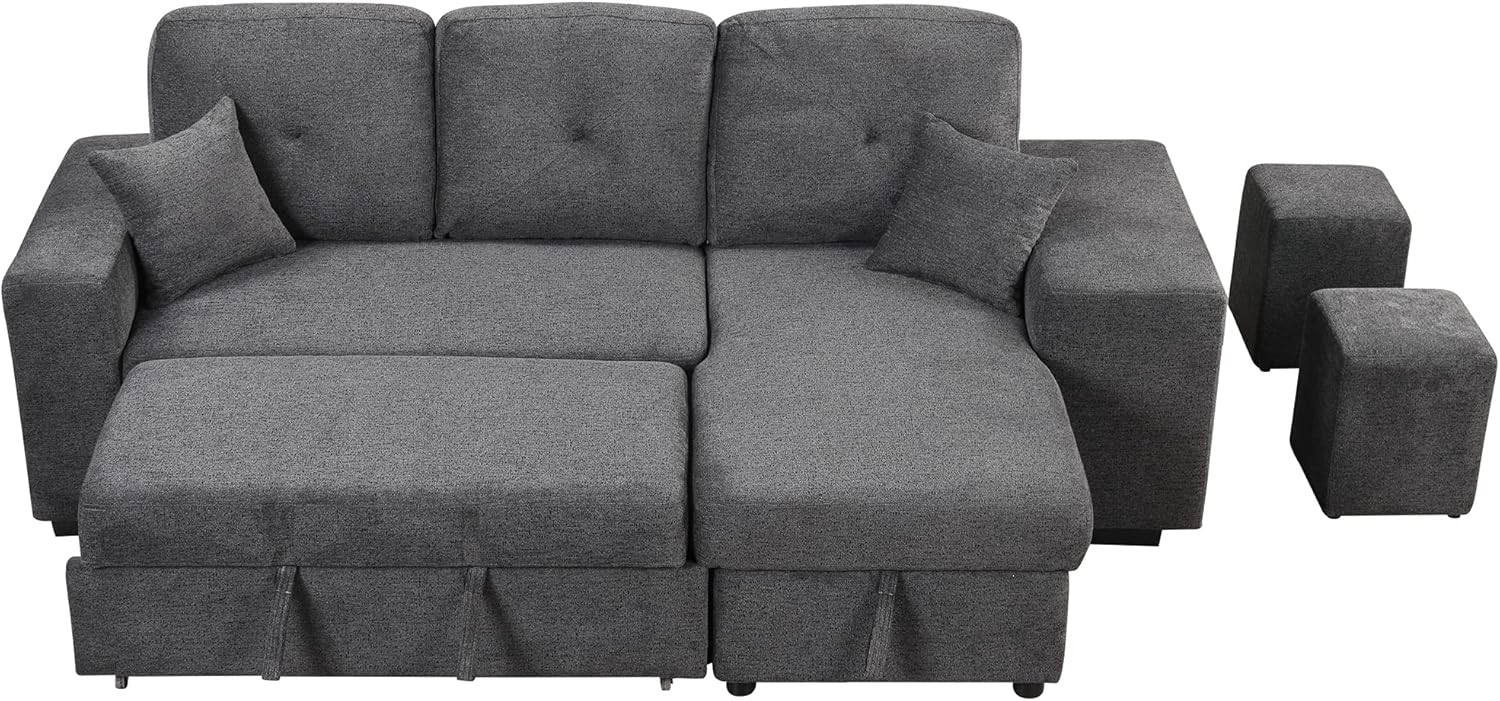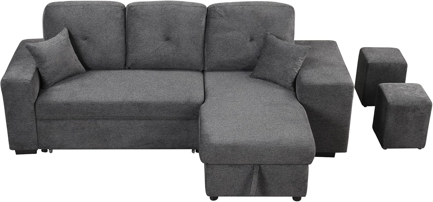 Reversible Sleeper Sectional Sofa Bed with Side Shelf and 2 Stools,Pull-Out L-Shaped Sofa Bed,Corner Sofa-Bed with Storage Chaise Left/Right Hande for Living Room,Knox Charcoal