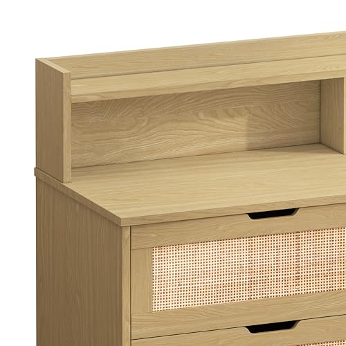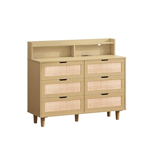 Rattan Sideboard Buffet Cabinet with 2 USB Ports and LED Lights Farmhouse Sideboard Buffet Cabinet with 6 Drawers 43" Wood Storage Cabinet for Living Room Entryway Kitchen Natural