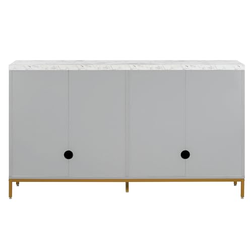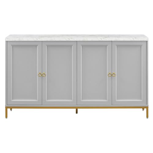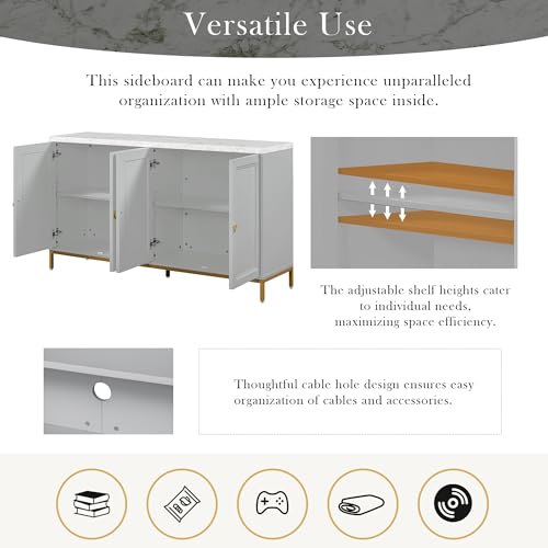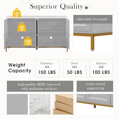 Wood Kitchen Sideboard Cabinet with Storage Modern Style, Large Storage Sideboard Buffet Cabinet with Doors and Metal Legs, Faux Marble Tabletop, Adjustable Shelves, Light Grey
