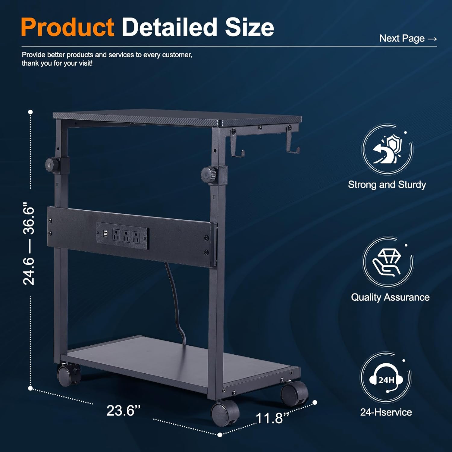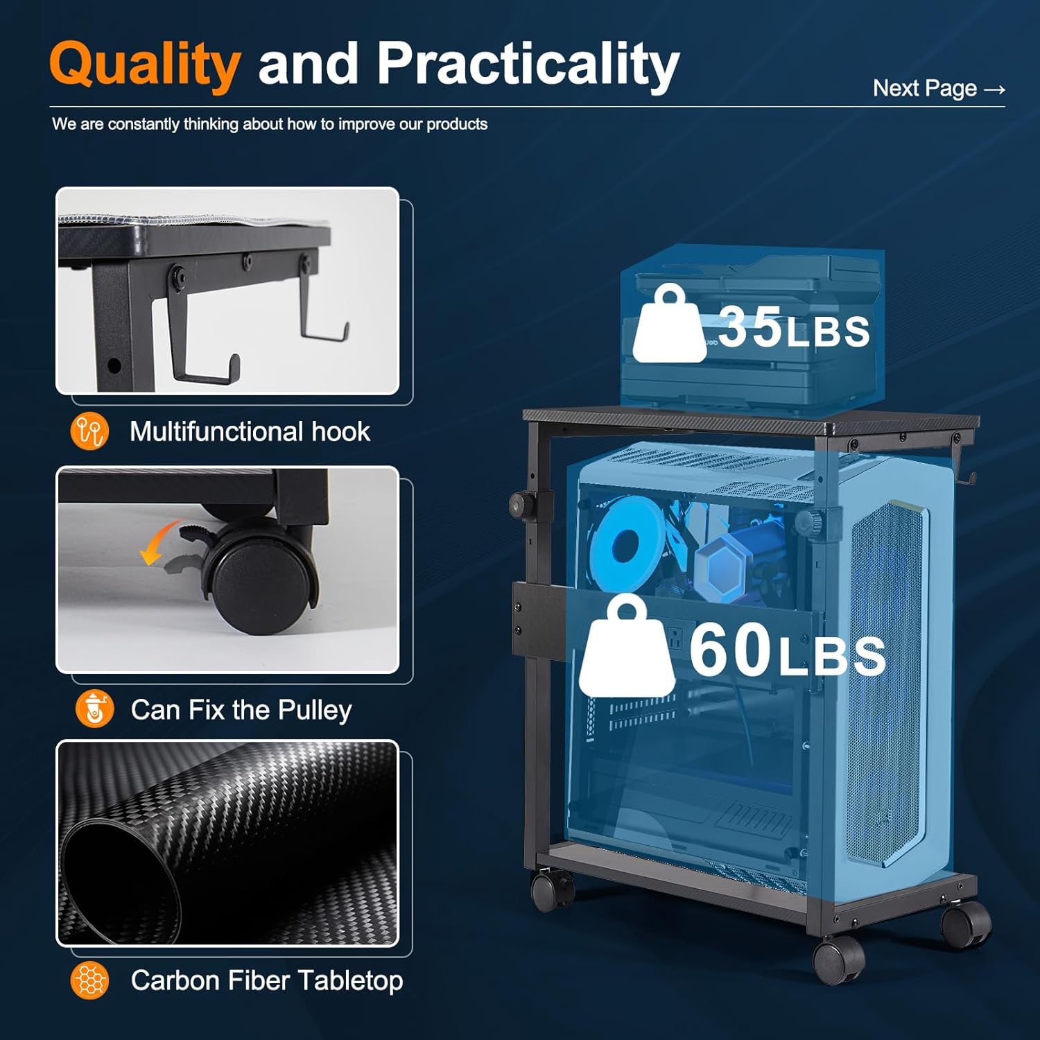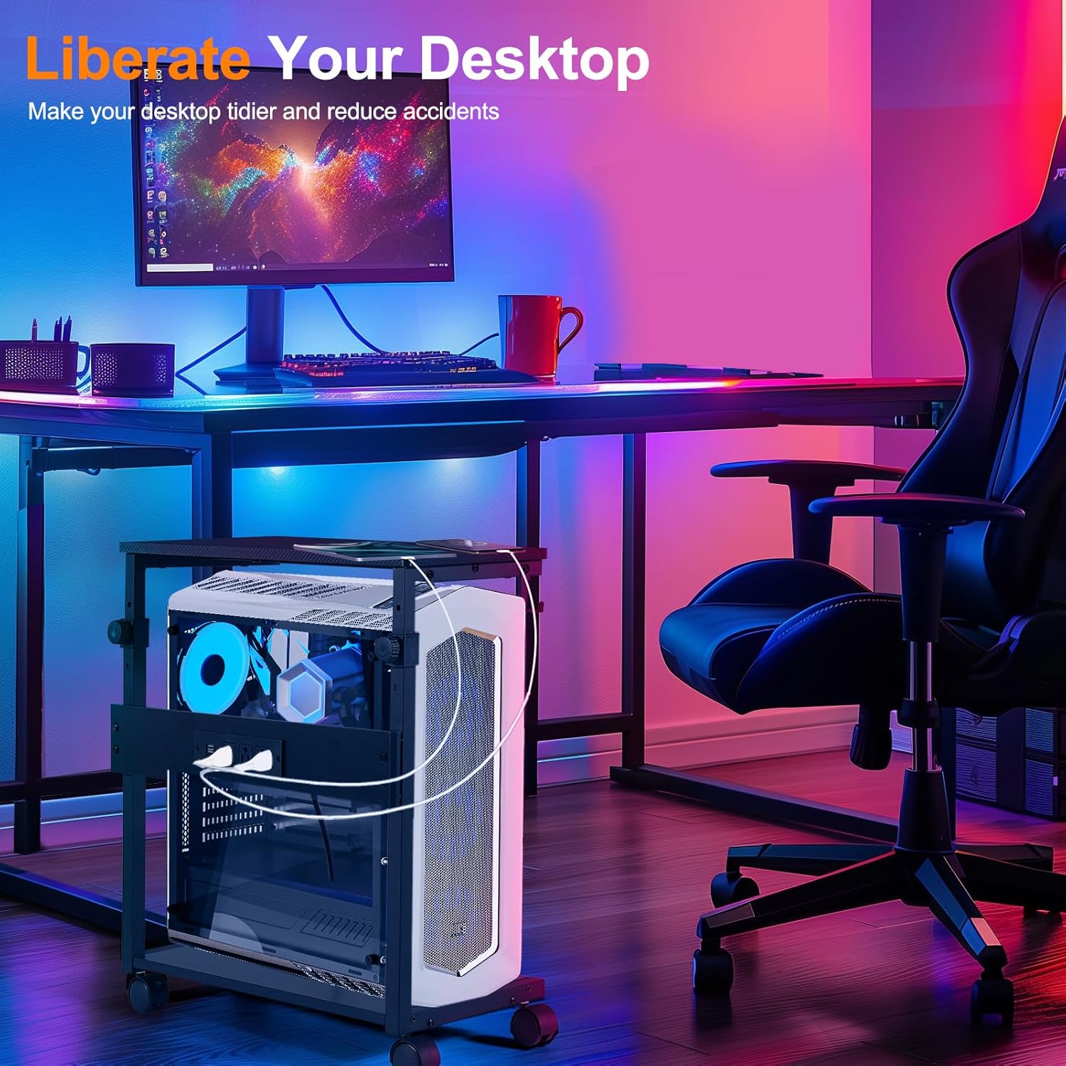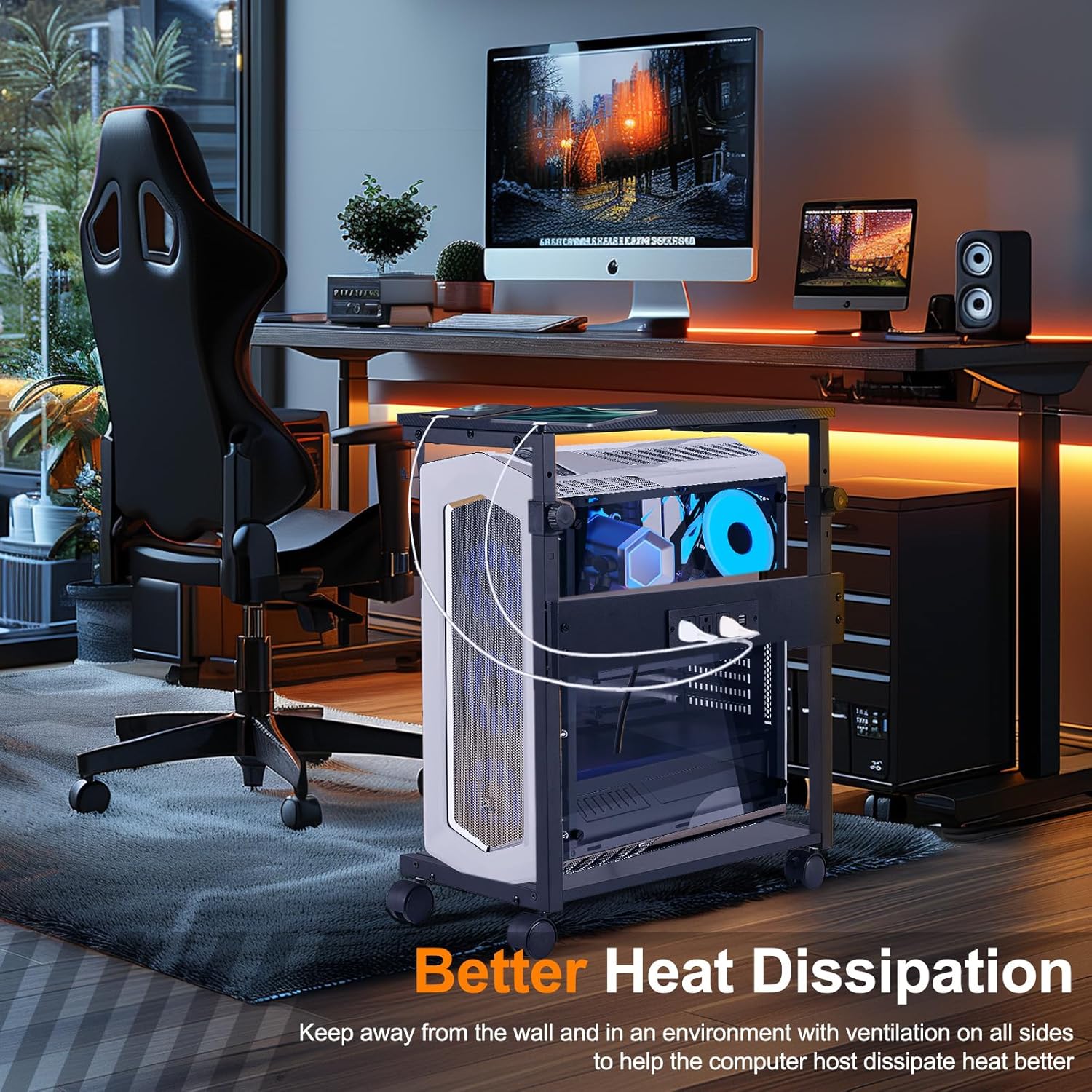 Computer Tower Stand with Charge Station,Height Adjustable 2-Tier ATX-Case,Mobile CPU Holder Cart with 2 AC Outlets & USB Port,Under Desk PC Laptop Home Office Gaming Accessories w/Rolling Wheels