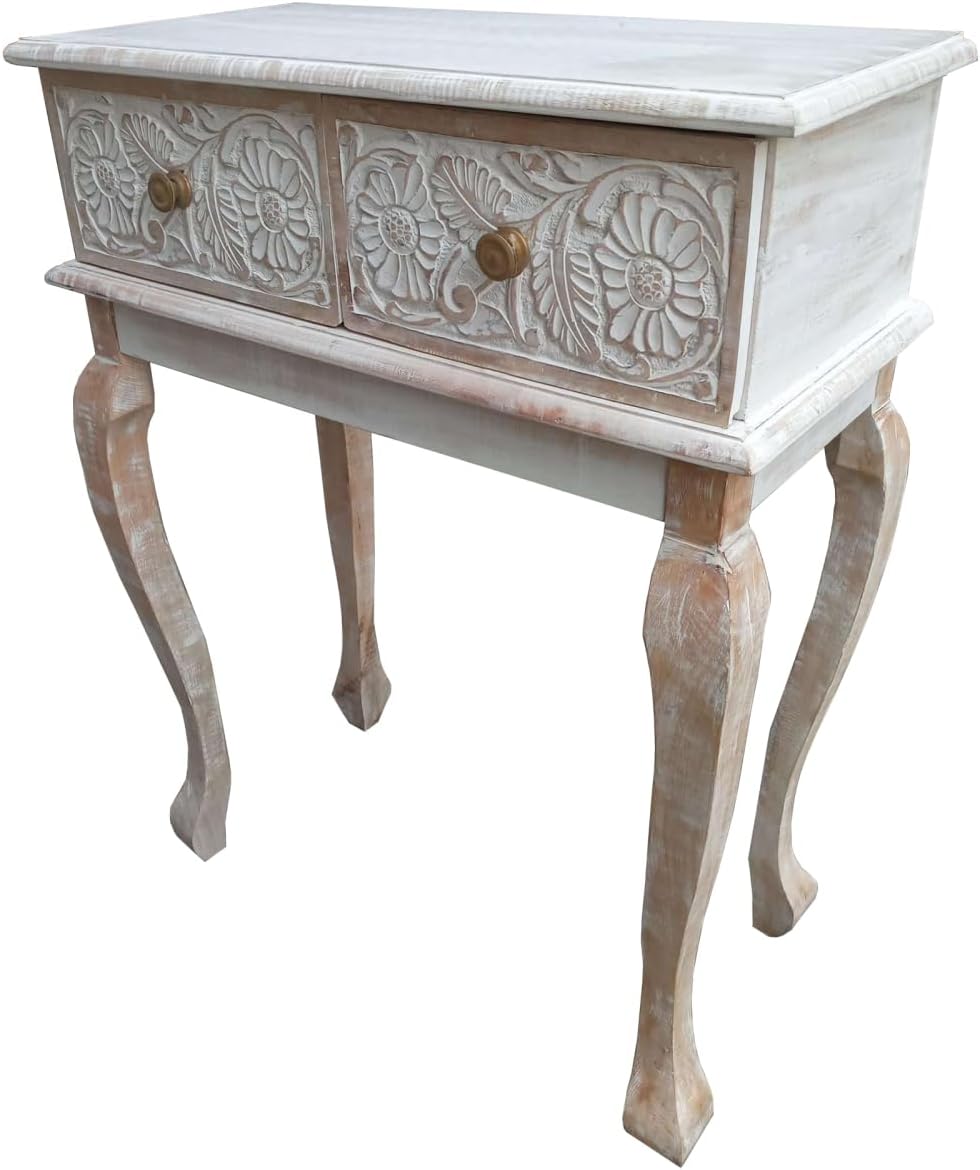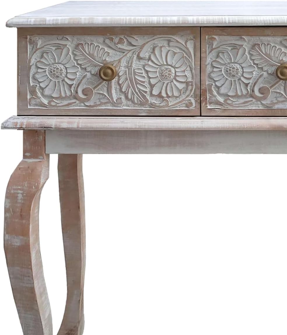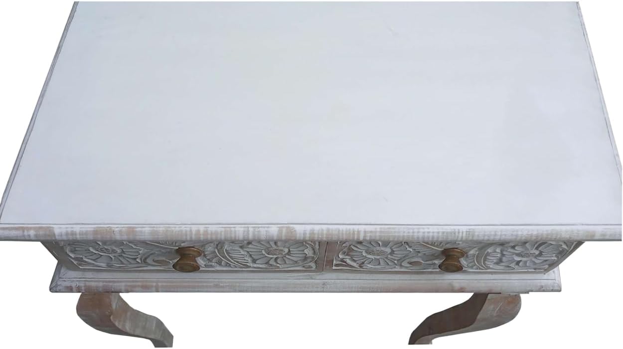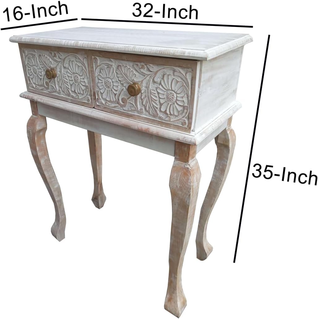 2 Drawer Mango Wood Console Table with Floral Carved Front, Brown and White