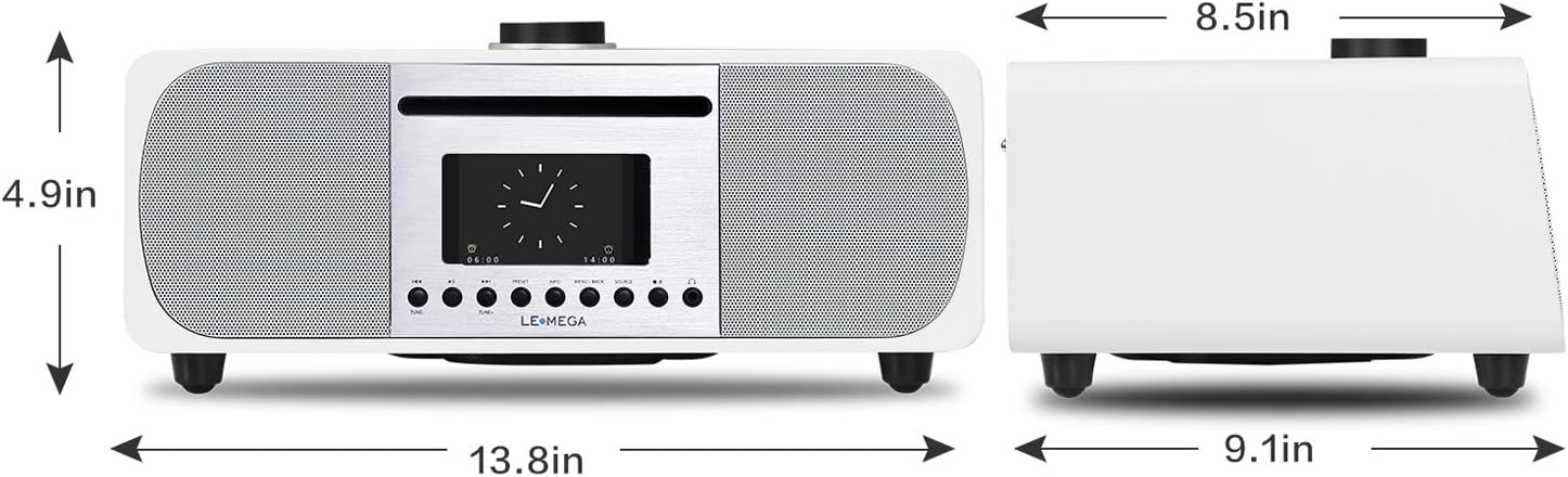 LMEGA M5+ All-in-One Music System CD Player,Internet Radio,FM Radio,WiFi,Spotify Connect,Bluetooth,Wooden Box,USB MP3,Headphone-Out,Clock&Alarms,Colour Display, Remote& app Control –White