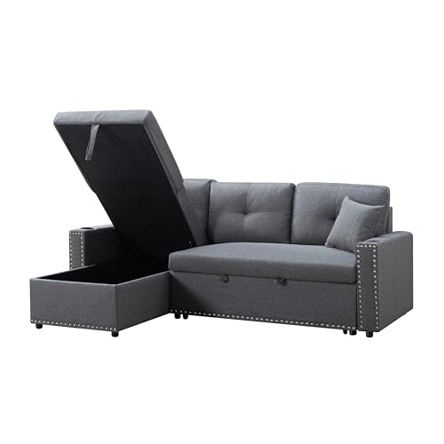 86.6" L-Shape Reversible Sectional Sleeper Sofa Couch with Storage Chaise Lounge and Pull Out Bed, Linen Upholstered Sofa for Living Room