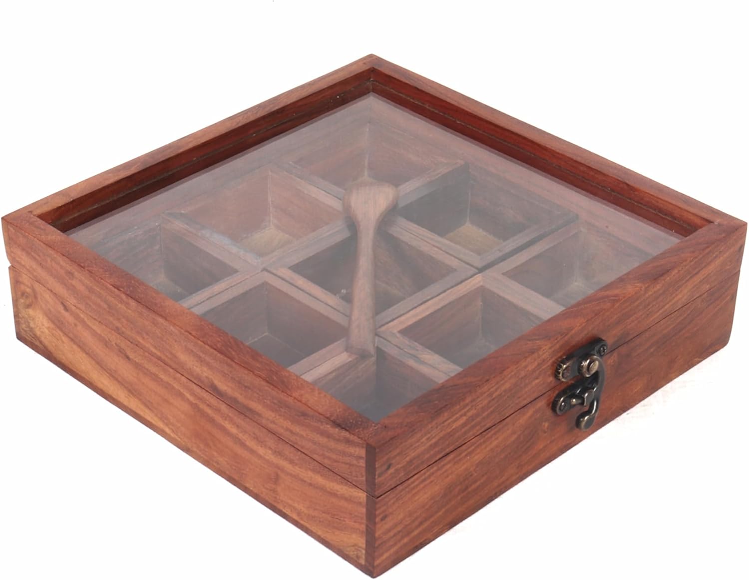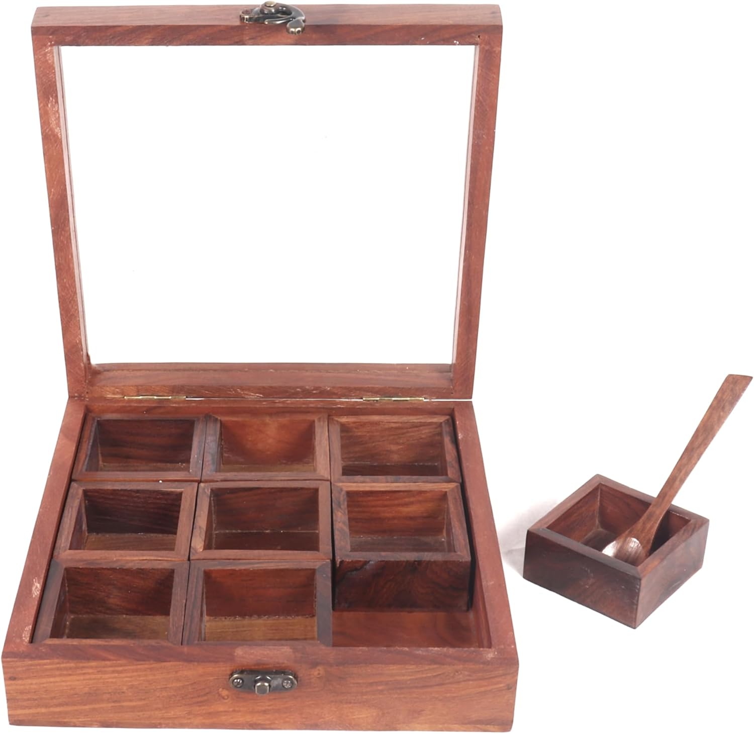 Wooden Spice Box with 9 Containers & Spoon in Sheesham Wood | Indian Spice Boxes for Kitchen, Masala Dabba, Masala Daani, Namak Dani, Multipurpose, BRWON