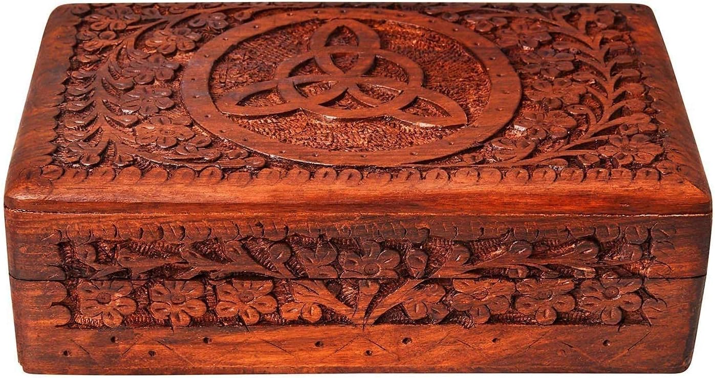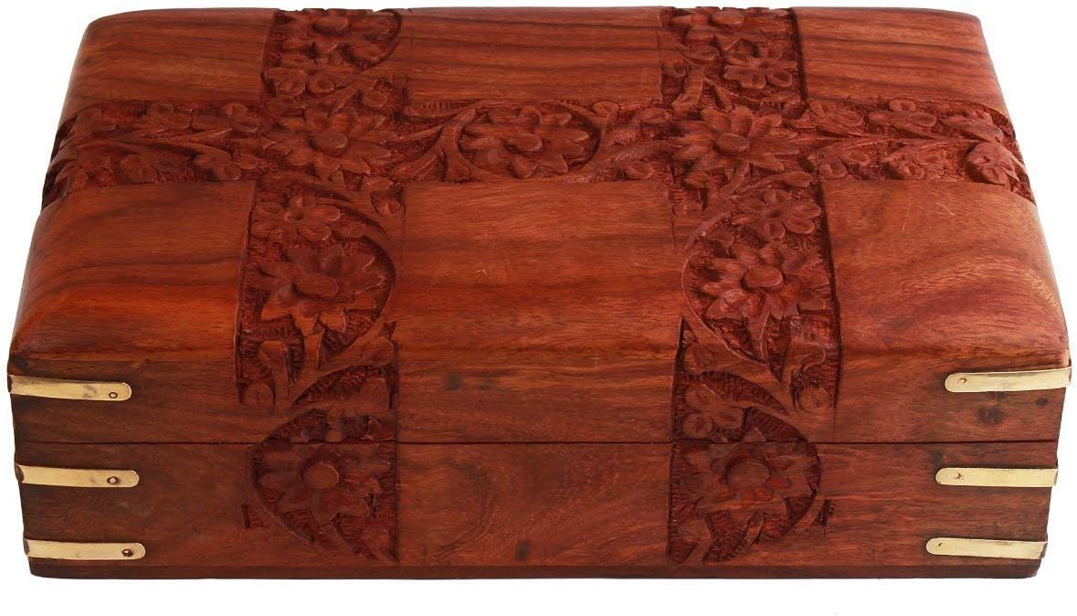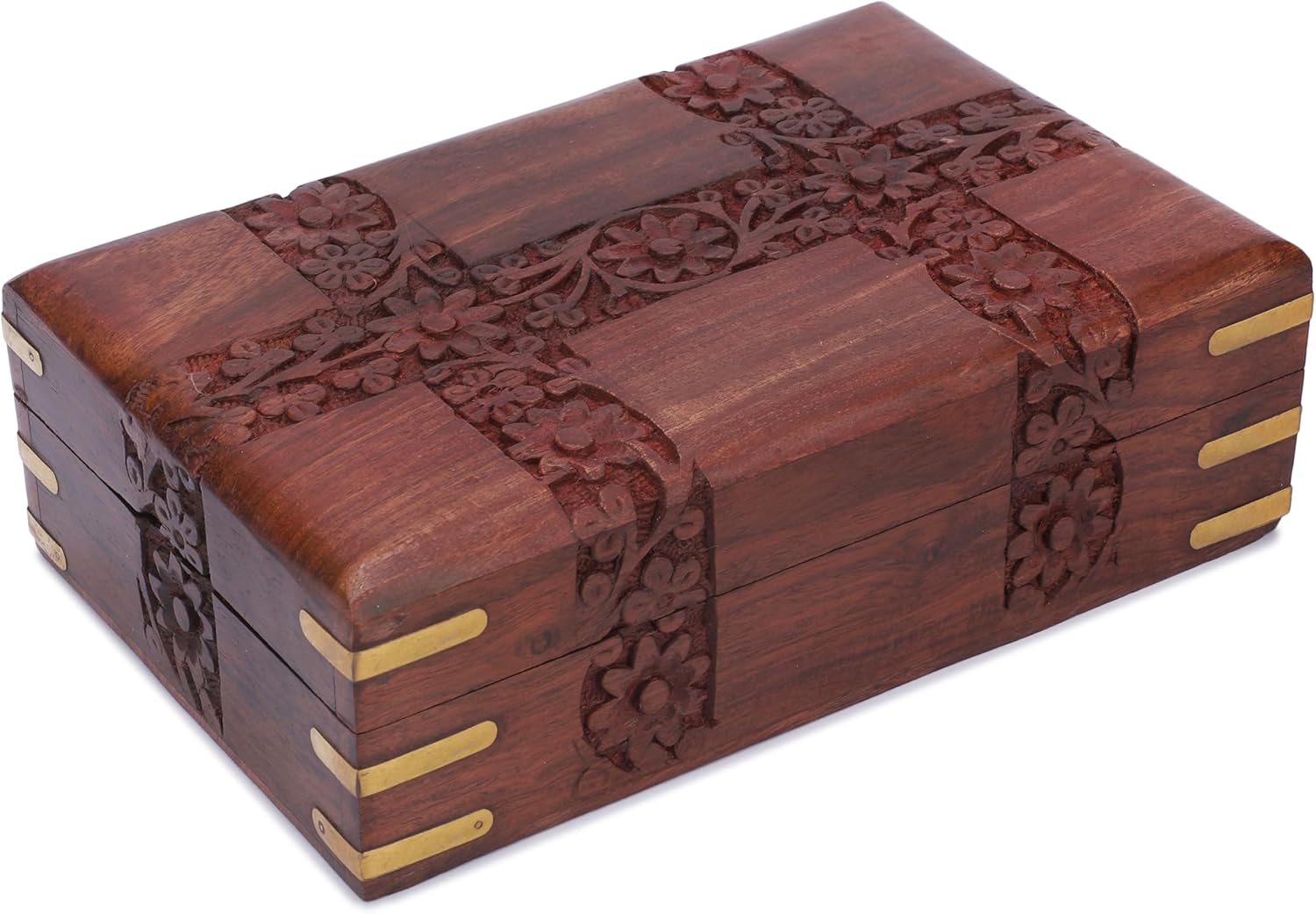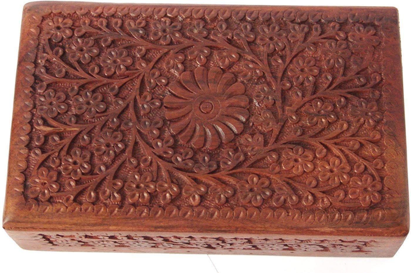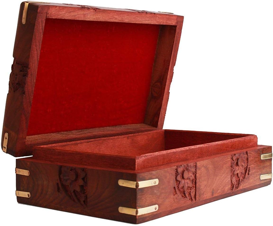 Ajuny Wooden Handcarved Decorative Jewelry Storage Box Flower Design Multipurpose Treasure Chest Keepsake Organizer Necklaces Watch Boxes Great for Gifts 8x5 Inch