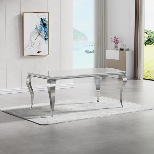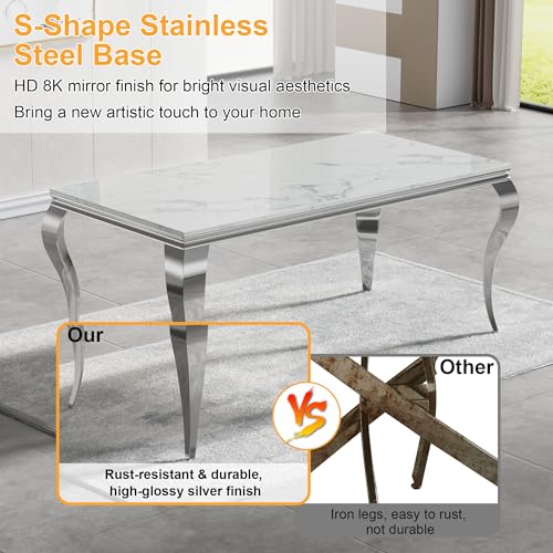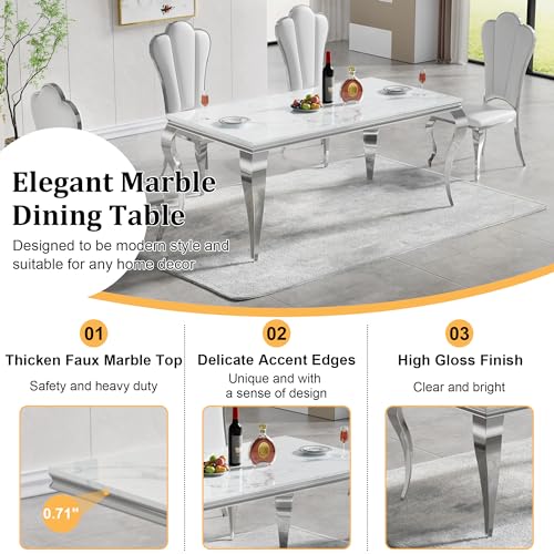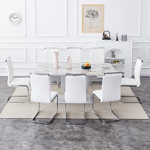 HomVent 70.08'' Faux Marble Dining Table Set for 8, Faux Marble Dining Table & Chair Sets, Modern Rectangle Faux Marble Table Top & Stainless Steel Base (White, 1 Table with 8 Grey Gold Chairs)