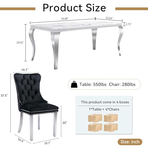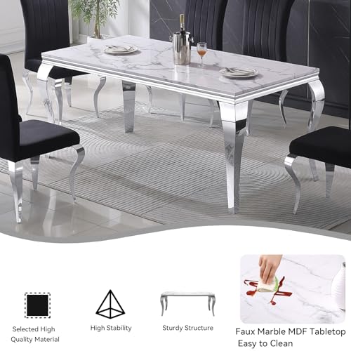 70" Modern Dining Table Set for 6, 7-Piece White Marble Dining Room Table Set, Kitchen Table with Faux Marble Top and S-shaped Silver Stainless Steel Legs & 6 Grey Velvet Dining Chairs