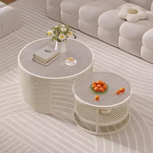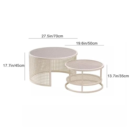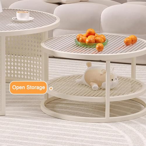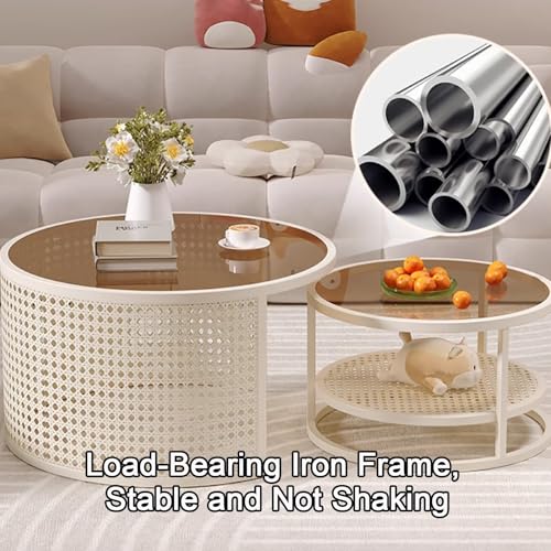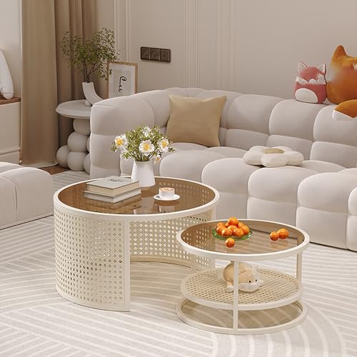 Round Coffee Table Set of 2, Nordic Style Glass Coffee Side Table, Coffe Table with Storage Shelf, for Living Room Bedroom Offic(Beige brown,23.6in/60cm)