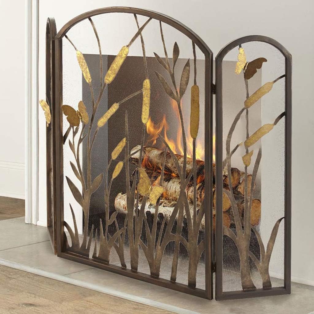 Fire Screen American Handcrafted Fireplace Screen with Net Butterfly Cattail Decorative Mantelpiece Hollow Partition Spark Fire Guard