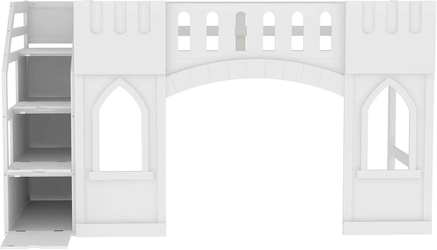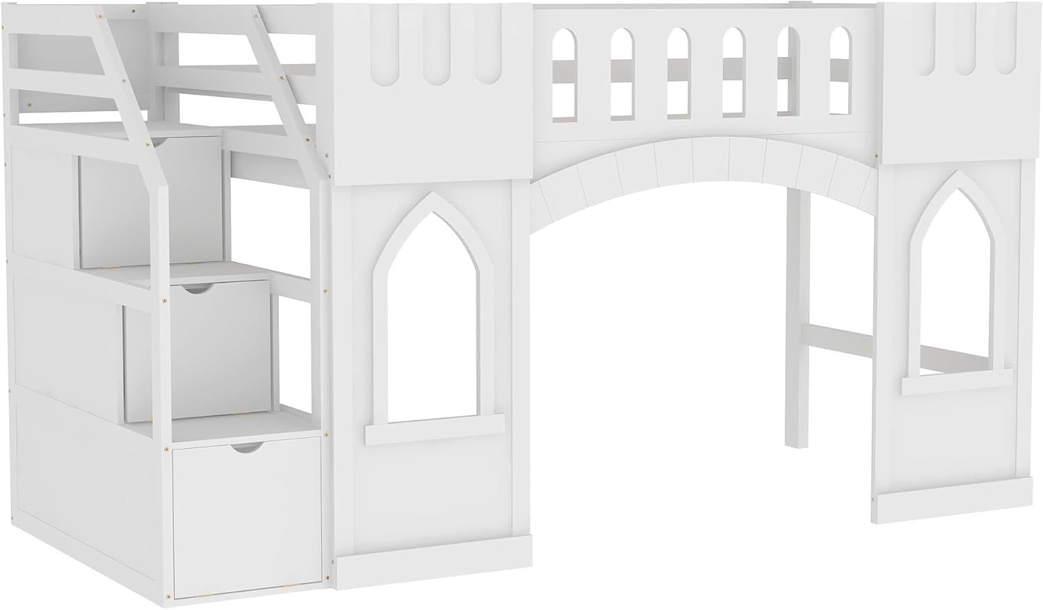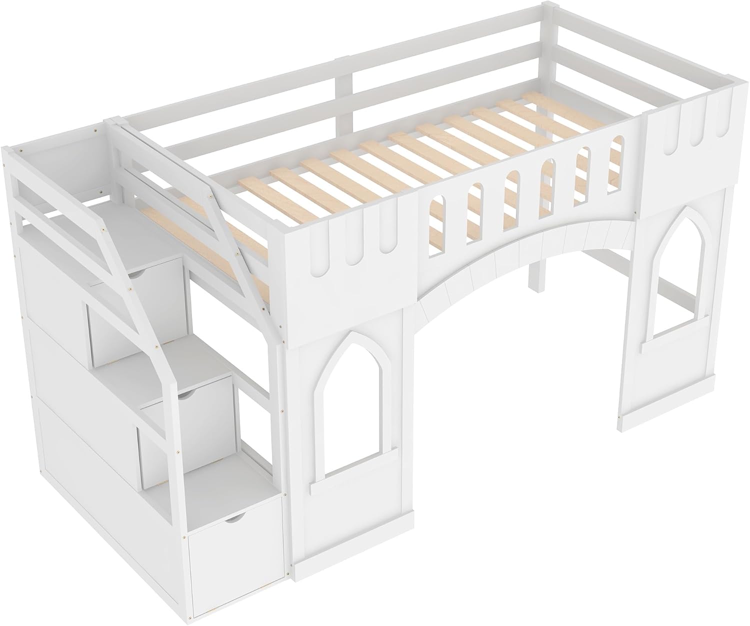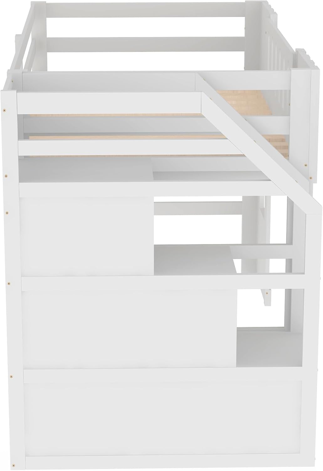 Stairway Twin Size Loft Bed with Storage Design for Kids Bedroom,Solid Wood Bedframe w/Safety Guardrails,No Box Spring Needed & Space Saving, White