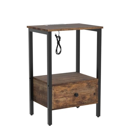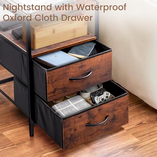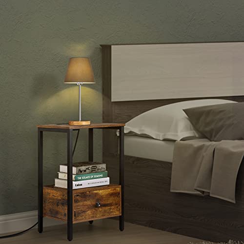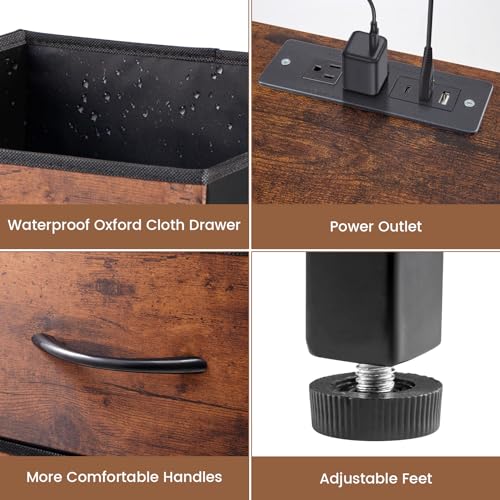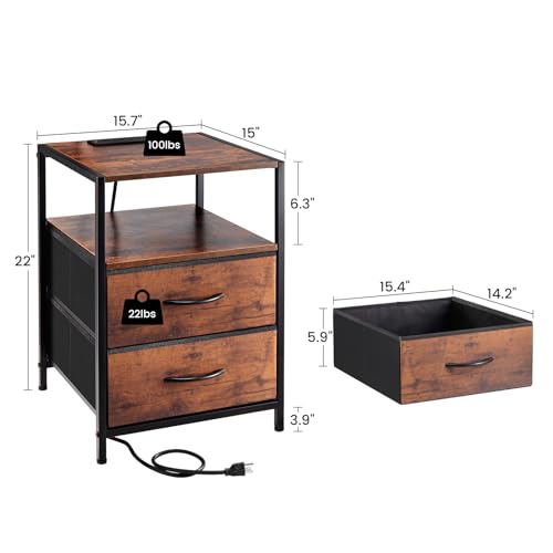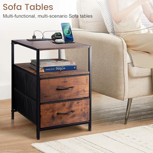 Nightstands Set of 2, Side Tables with USB Ports and Outlets, Modern nightstand Living Room Tables with Fabric Drawers Open Storage Shelves for Bedroom, Office, Small Spaces, Brown