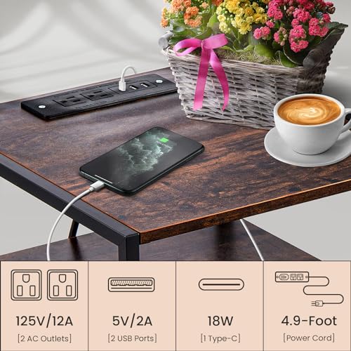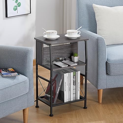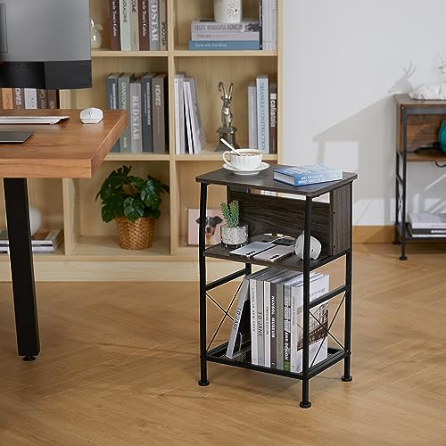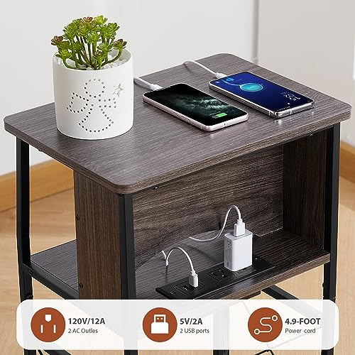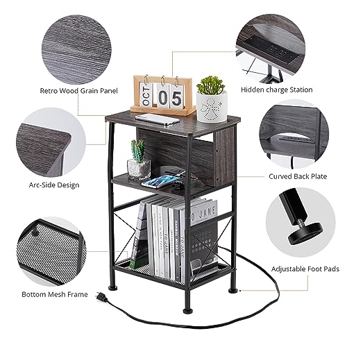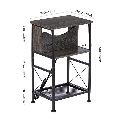 3 Tier Narrow Side Table with Charging Station, Slim End Table Nightstand Table Storage Shelf With Hidden USB Ports , Two Installation Methods For Small Spaces/Bedroom/Living Room/Office,Rustic Brown