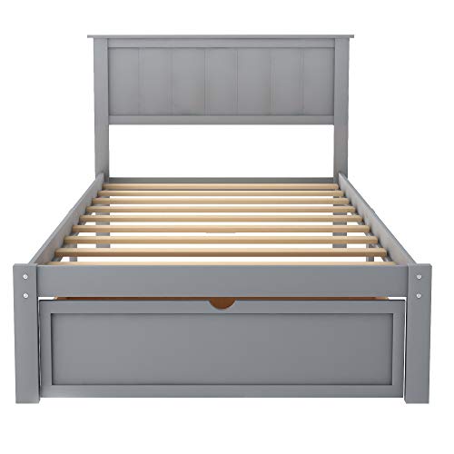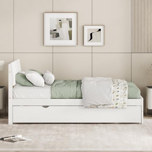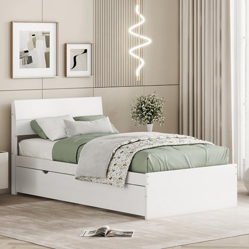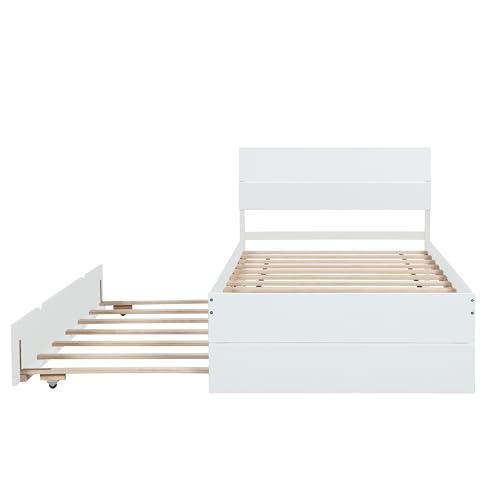 HomSof Modern Twin Bed Frame with Trundle for White High Gloss with Light Oak Color