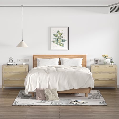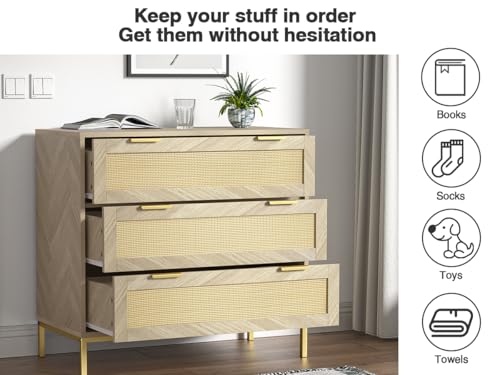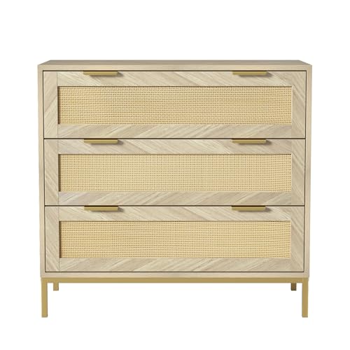 Anmytek 3 Drawer Dresser for Bedroom with Natural Rattan,Closet Dressers Chest of Drawers for Bedroom,Farmhouse Wood Large Nightstand with Storage Versatile Bedside Table for Bedroom