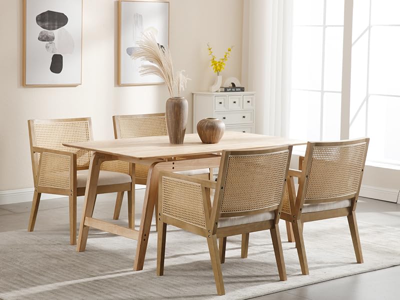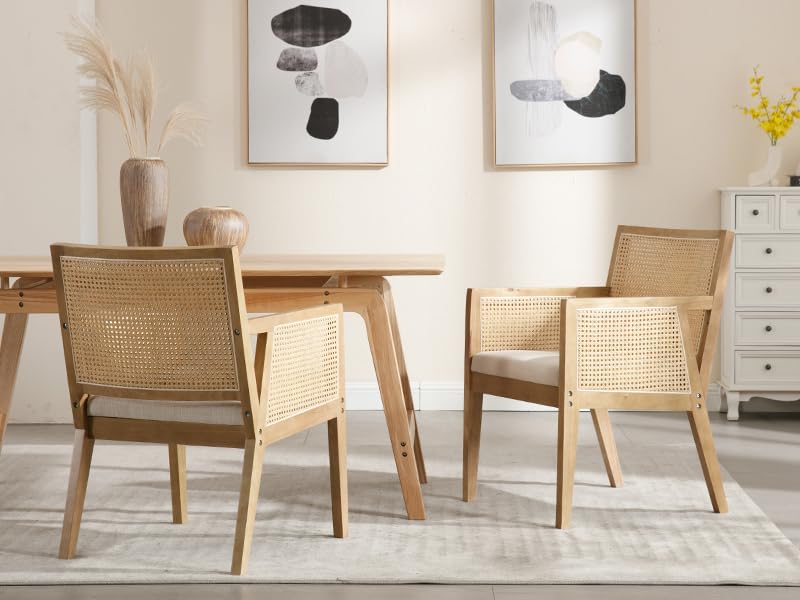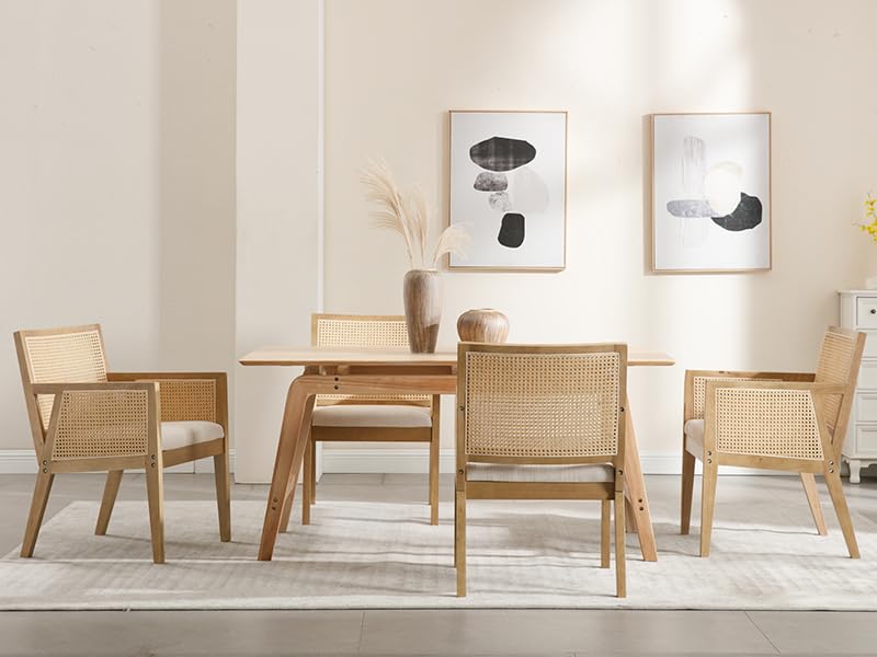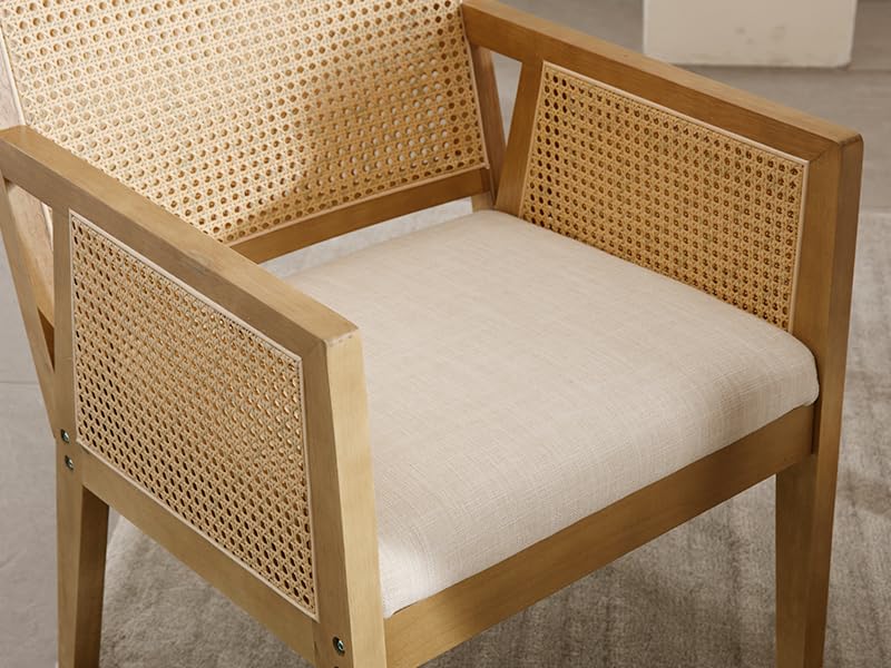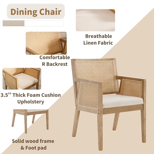 Farmhouse Rattan Dining Chairs Set of 4, Mid Century Modern Upholstered Dining Chairs, Wooden Linen Kitchen & Dining Room Armchairs Accent Chairs with Cane Back and Black Hardwood Frame, Beige