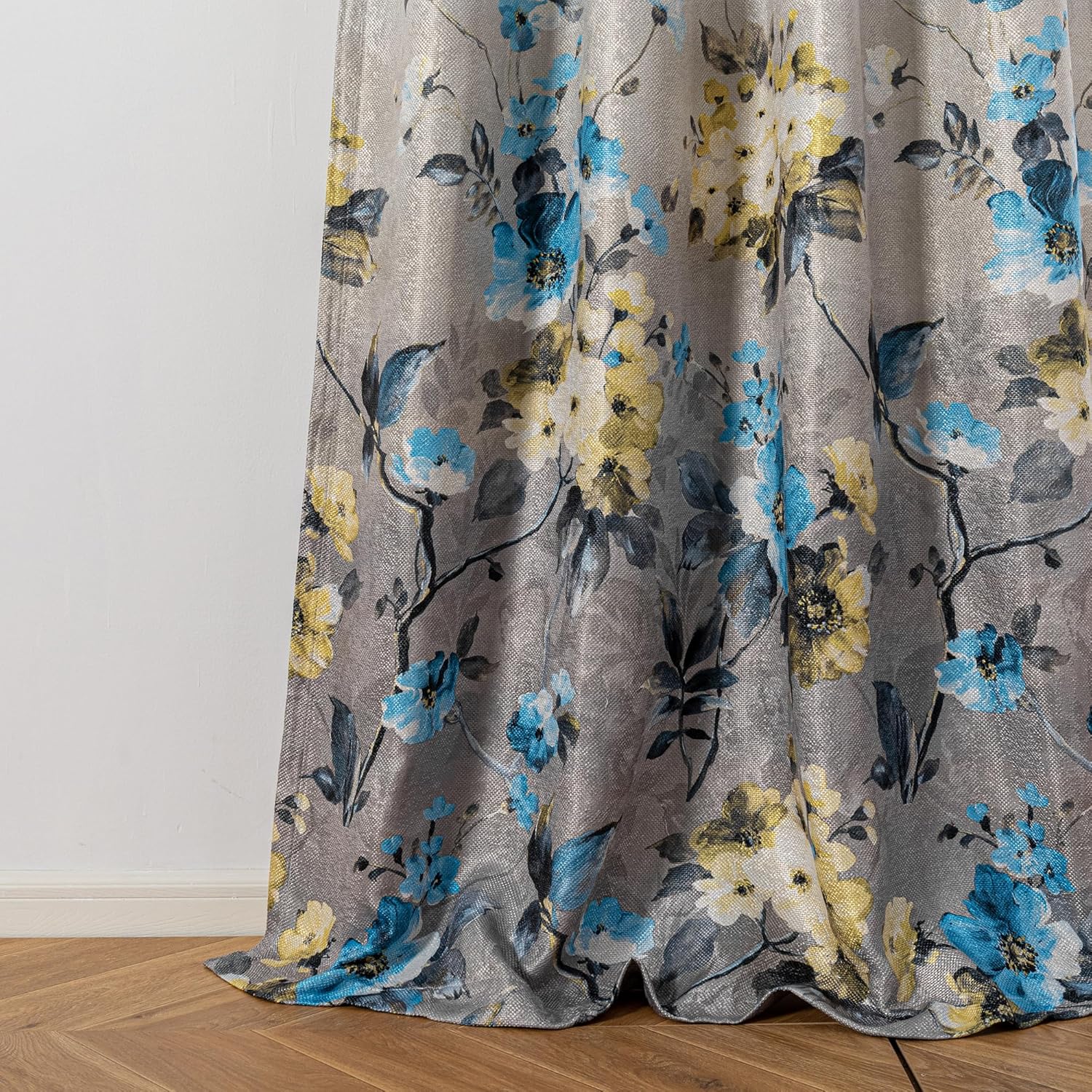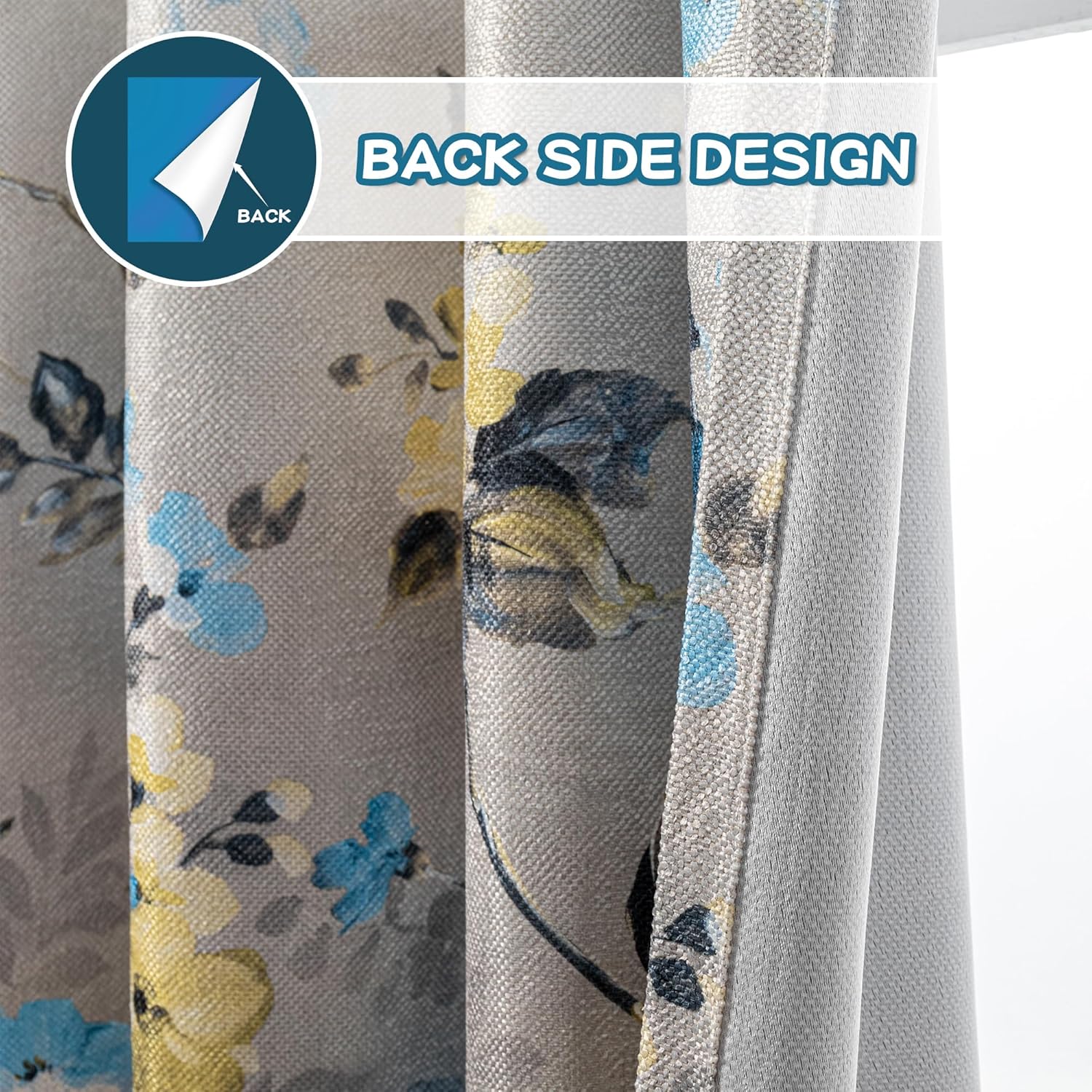 MYSKY HOME Blue Curtains 95 inches Long Set of 2 Panels Printed Flower Grommet Thermal Insulated Linen Look Textured Curtains for Living Room, Bedroom, Blue and Grey