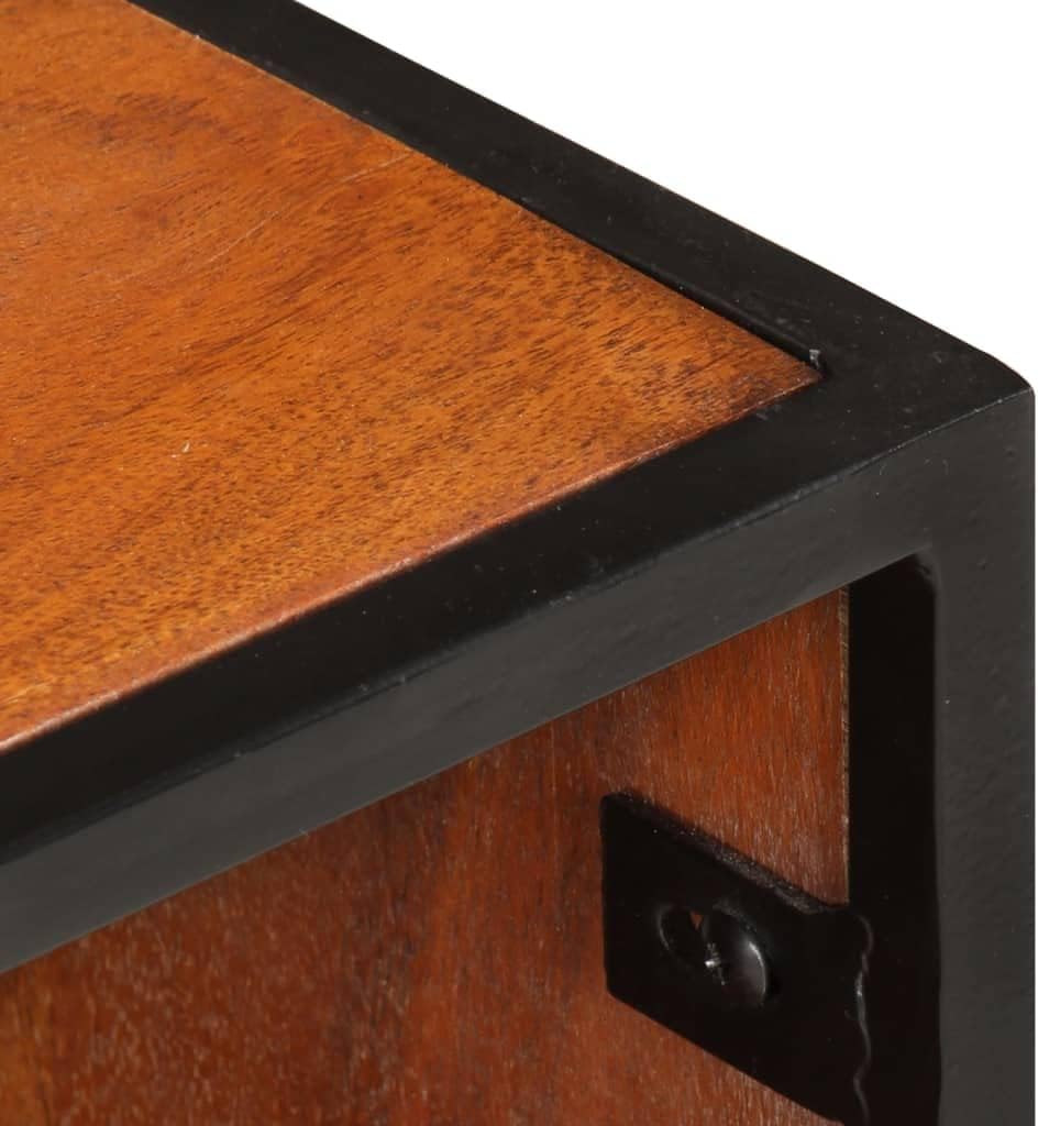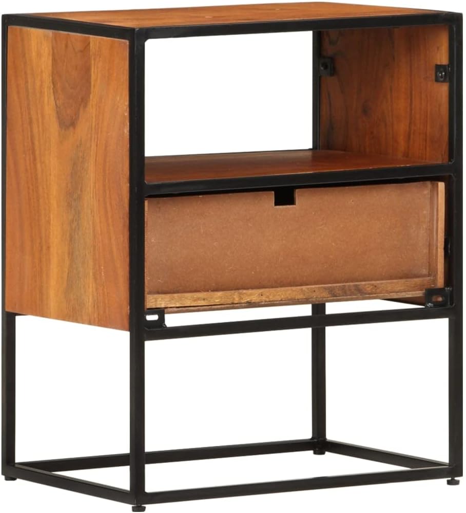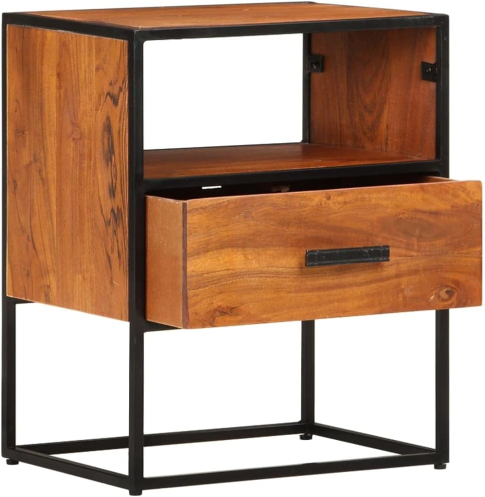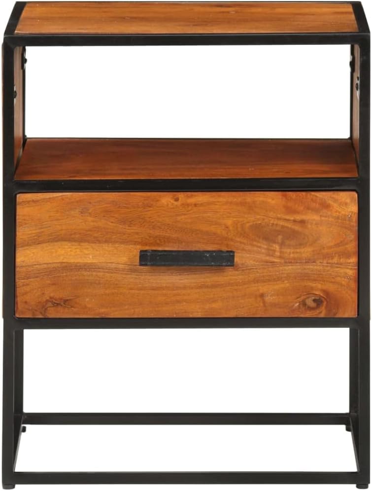 vidaXL Solid Acacia Wood Bed Cabinet with Iron Legs, Elegant Vintage-Industrial Style, Featuring Spacious Drawer and Compartment for Storage