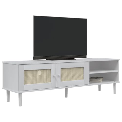 XAVIER Display CabinetSofa Tables Tv Cabinets Consoles Entertainment TV Stand SENJA Rattan Look White 62.2"x15.7"x19.3" Solid Wood Pine Suitable for Living Room, Bedroom, Porch, Office