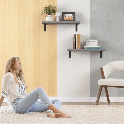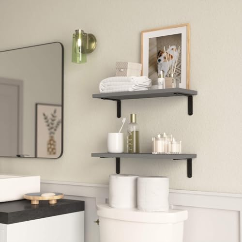 RICHER HOUSE Rustic Wood Bathroom Shelves Set of 2, Farmhouse Style Floating Shelf for Wall Décor, Hanging Shelves for Bedroom, Storage, Kitchen, Living Room - Grey
