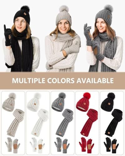 Womens Beanie Hat Scarf Gloves Set, Fleece Lined Winter Hat with Pom Pom, Long Knit Scarf Touchscreen Gloves for Cold Weather