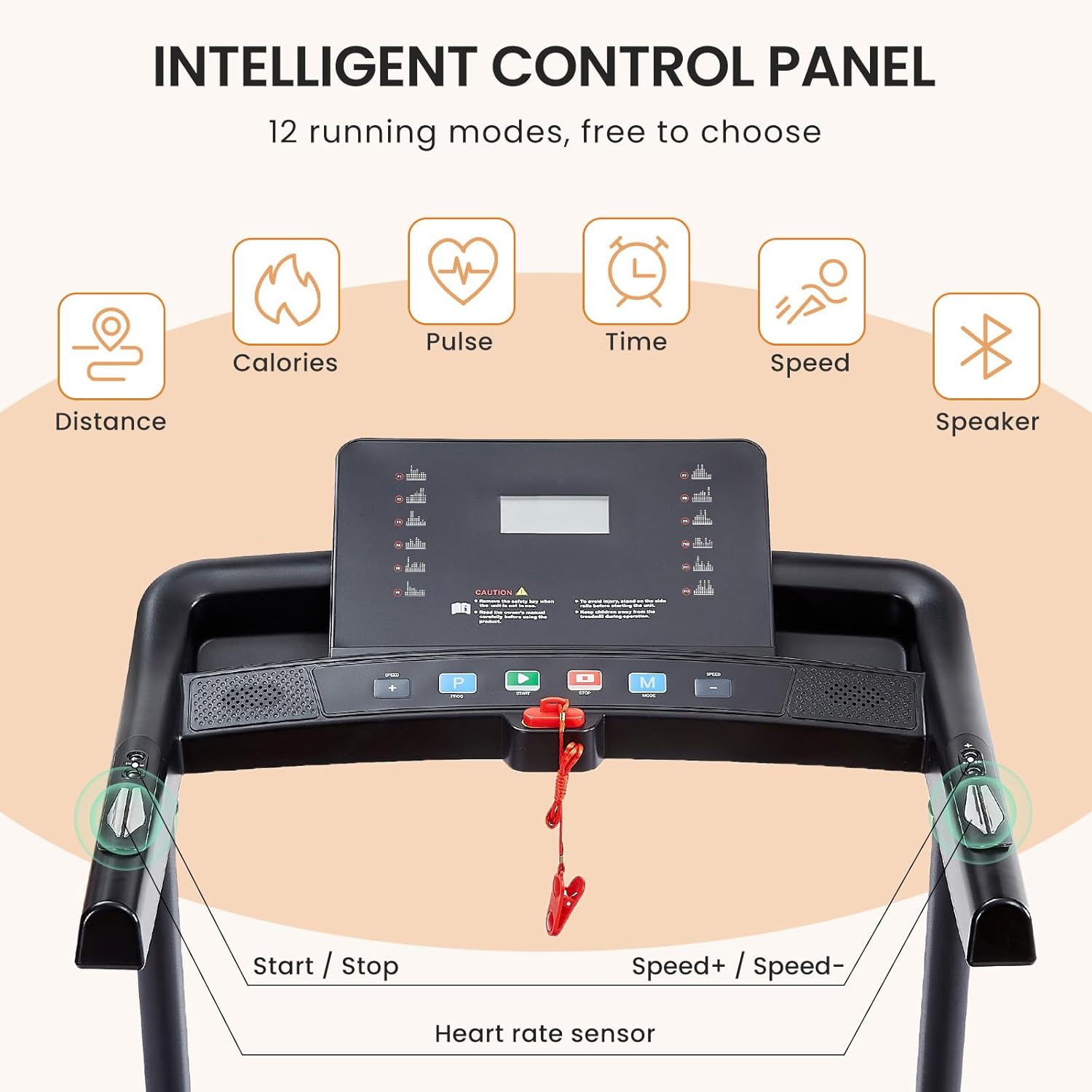 Treadmill - 2.5 HP Folding Treadmill, Easy to Move, with 3-Speed Incline Adjustment and 12 Preset Programs, 3 Countdown Modes, Heart Rate, Bluetooth, etc. Suitable for Home and Gym
