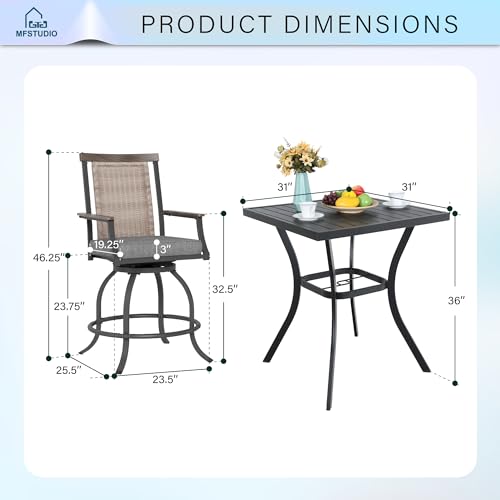MFSTDUIO Outdoor Bar Set of 3 with 2 Swivel Rattan Backrest Metal Patio Bar Stool and 1 Square Metal Table, All Weather Resistant Patio Table and Chair Set