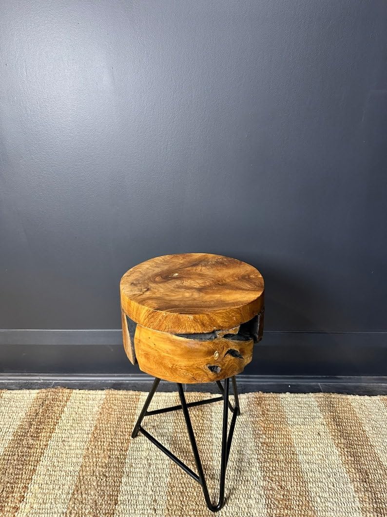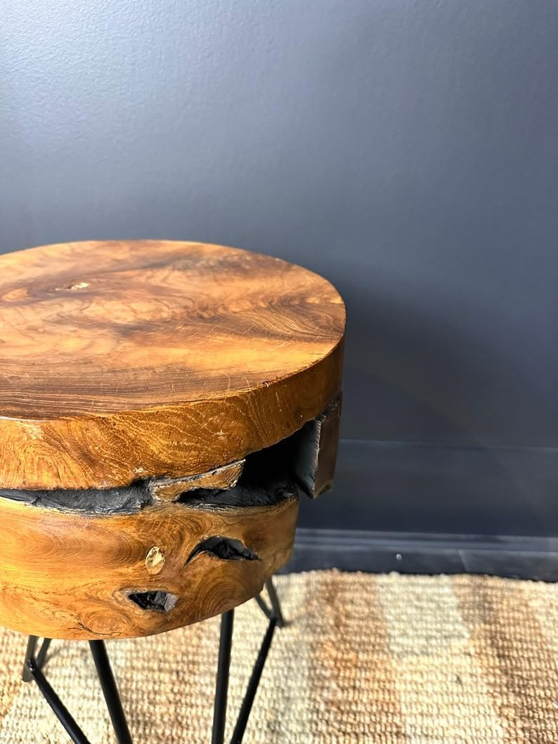 Teak Round Live Edge Table, Wooden Side Table, Pin Legs, Modern Rustic End Table