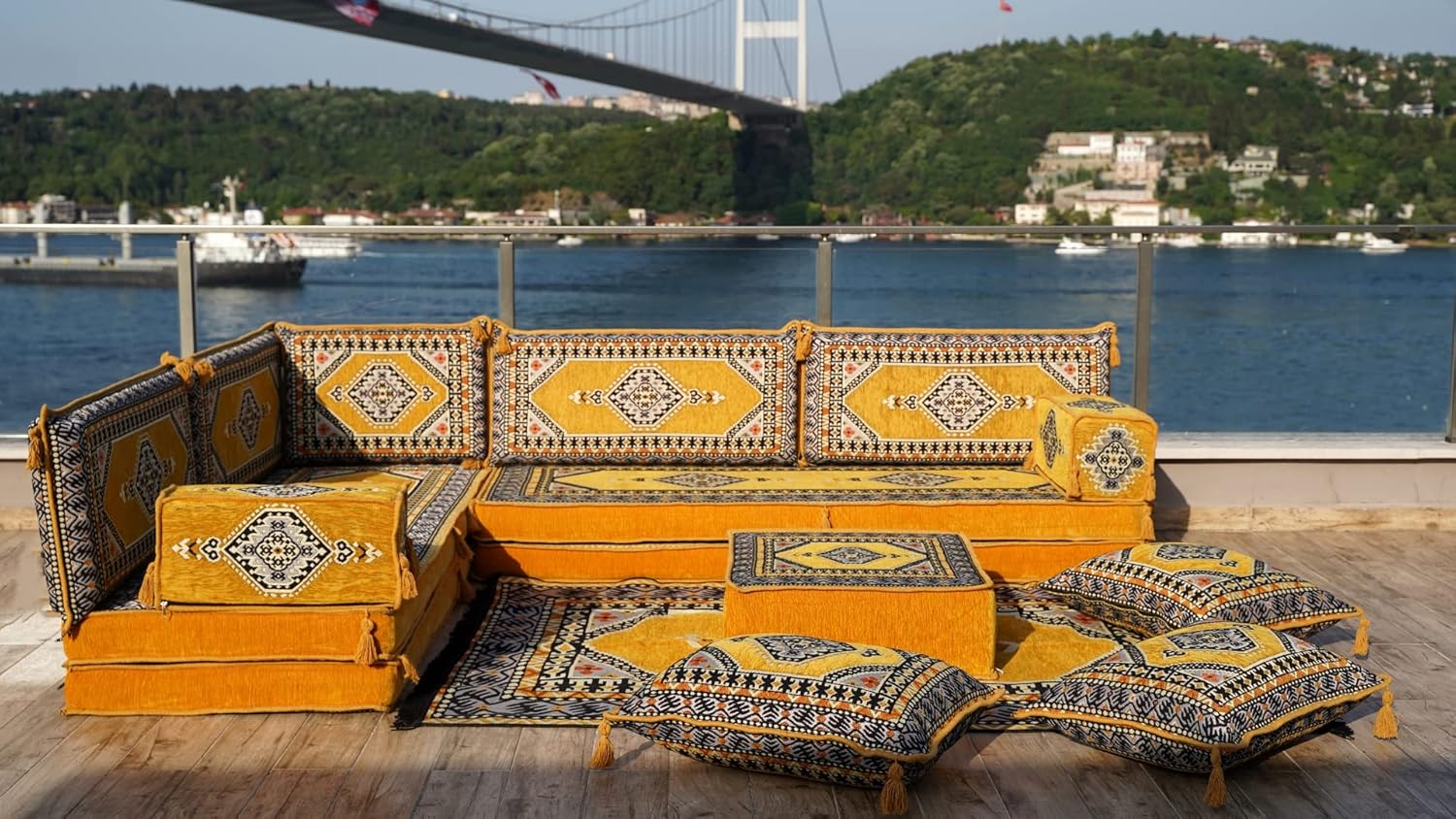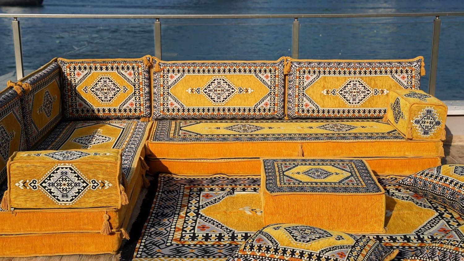 Floor Cushions, L Shaped Sectional Sofas, Mustard Yellow Arabic Sofa Set, Pallet Sofa, Arabic Majlis, Pouffs, Turkish Floor Seating Set (L Sofas + Rug + Ottoman)