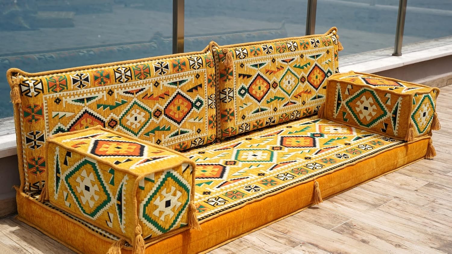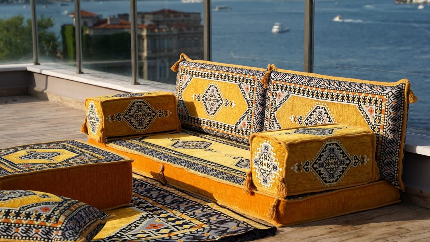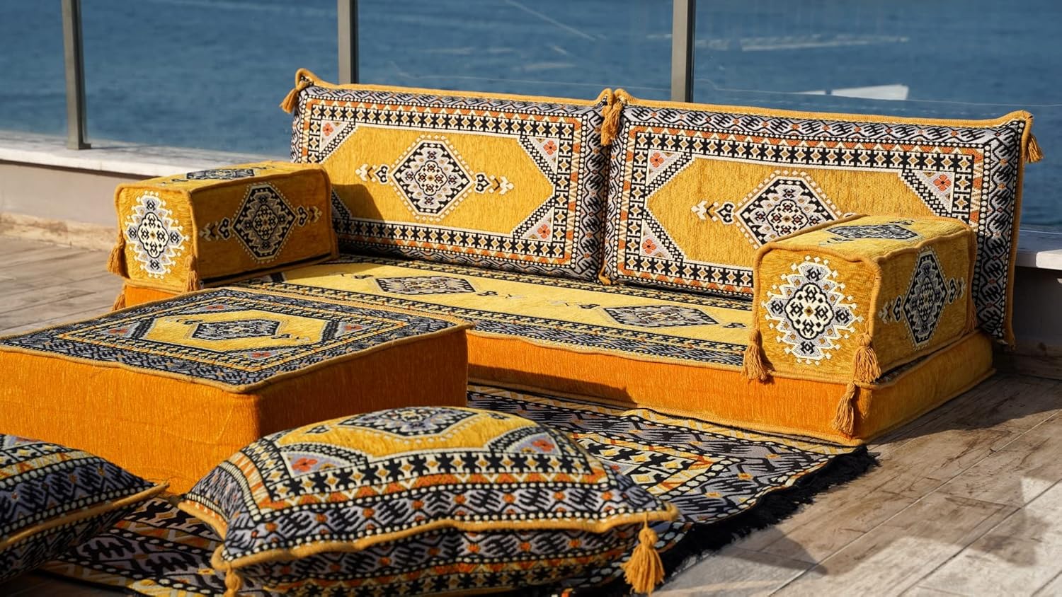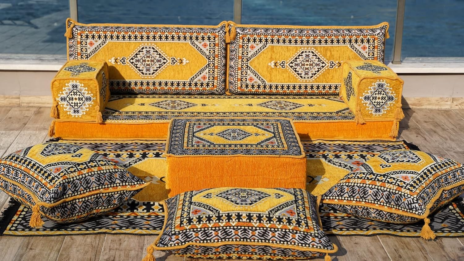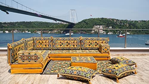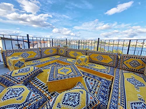 U Shaped Yellow Sectional Sofas, Floor Cushions, Arabic Floor Sofa Set, Garden Pallet Sofa, Arabic Majlis, Pouffs Turkish Floor Seating Set (U Sofas + Rug + Ottoman)