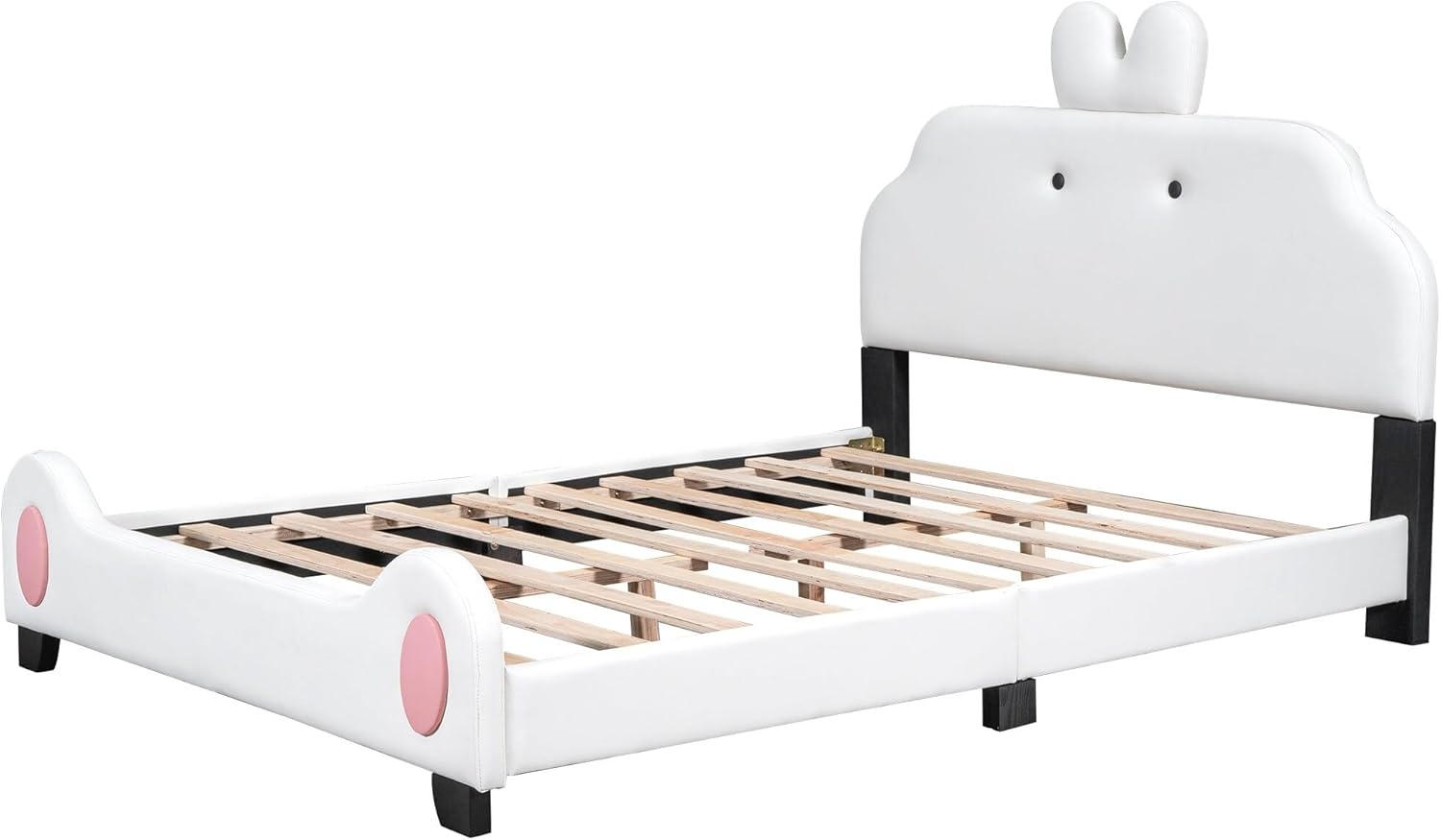 Kids Full Platform Bed with Cartoon Cute Headboard and Footboard Upholstered Size Frame Wooden Slats Support White Modern Contemporary Vintage Girls Space Wood Finish