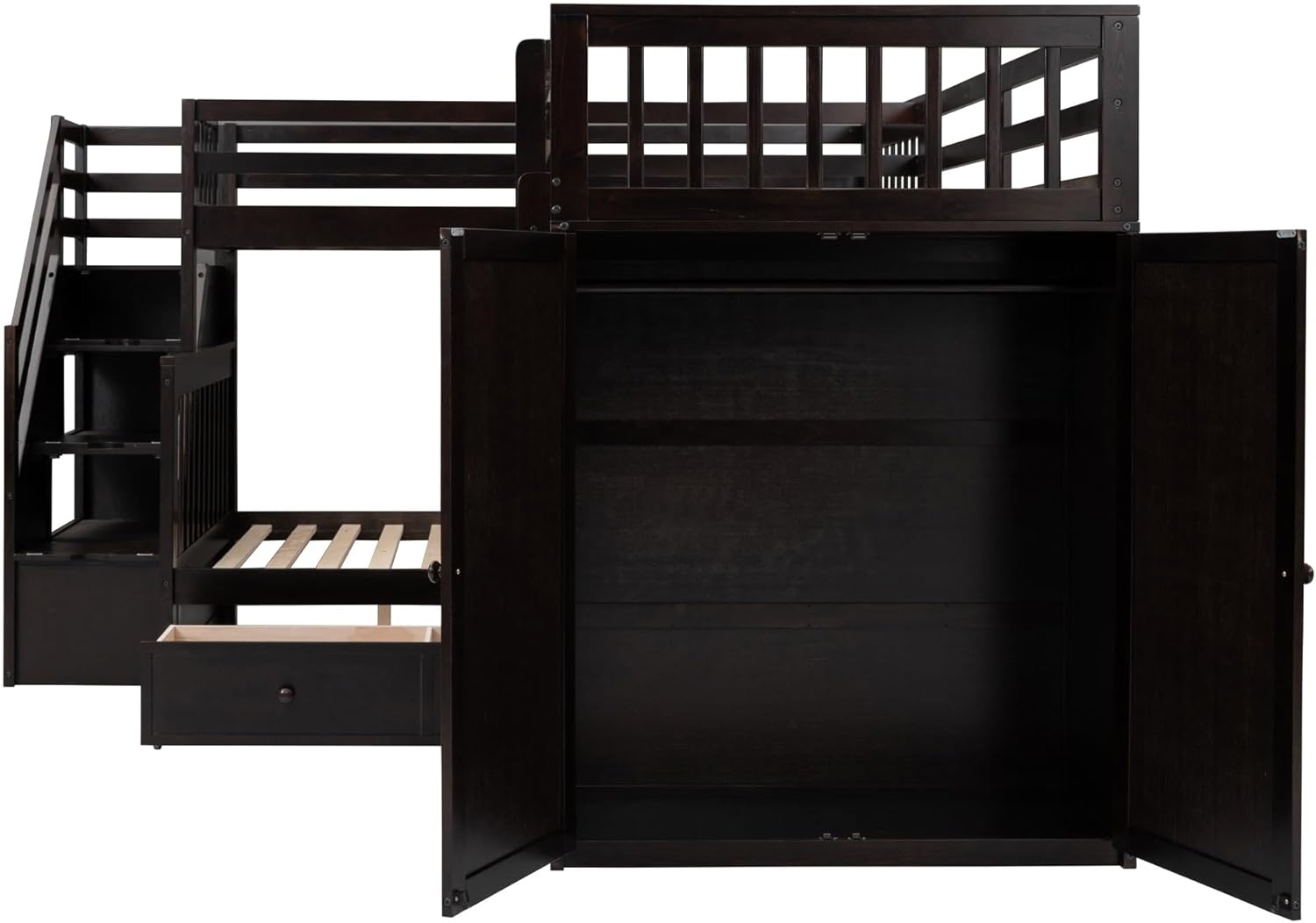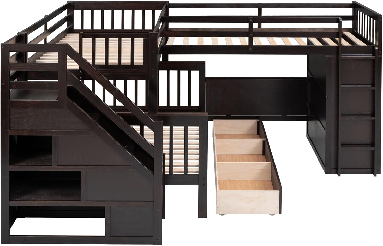 Twin-Twin Over Full L-Shaped Bunk Bed with 3 Drawers Portable Desk and Wardrobe Brown Modern Contemporary Space Wood Finish Hidden Storage