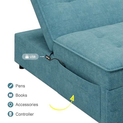 Convertible Sofa Bed with Storage Pocket and USB Ports, Foldable Ottoman Single Sleeper Sofabed, Lounger Sofa Chair for Living Room, Office, Bedroom, Teal