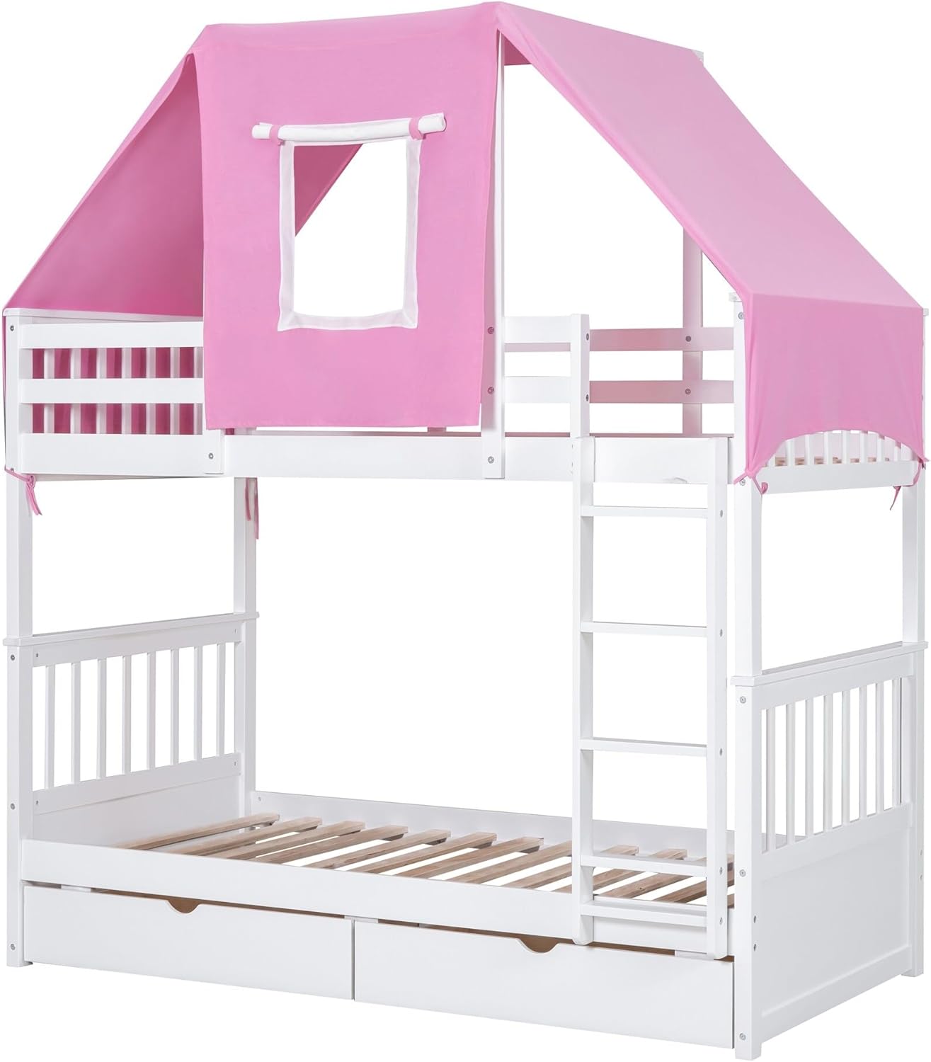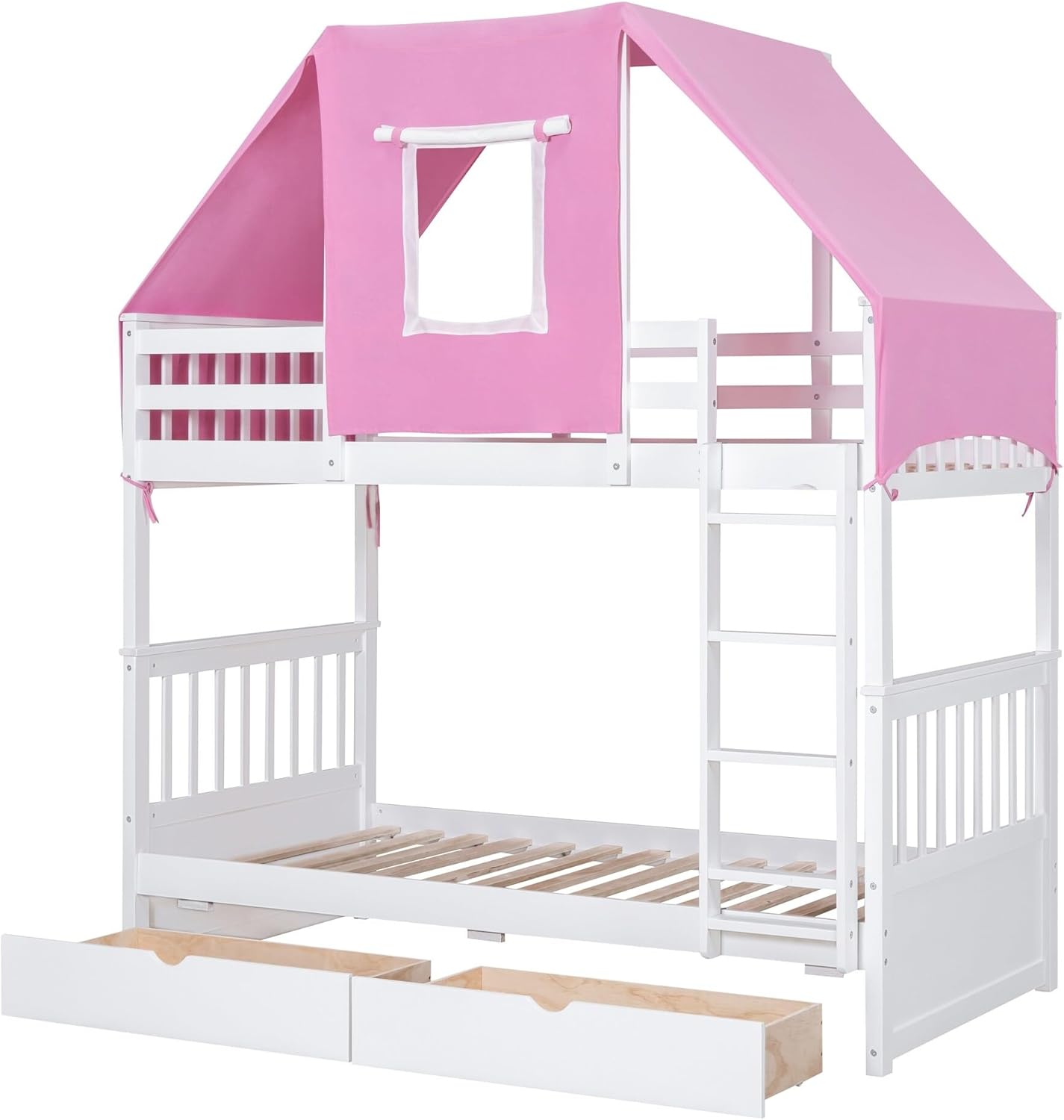 White+Pink Wood Twin-Twin Bunk Bed W/Tent Drawers Split Into 2 White Modern Contemporary Unisex Nature Finish Hidden Storage