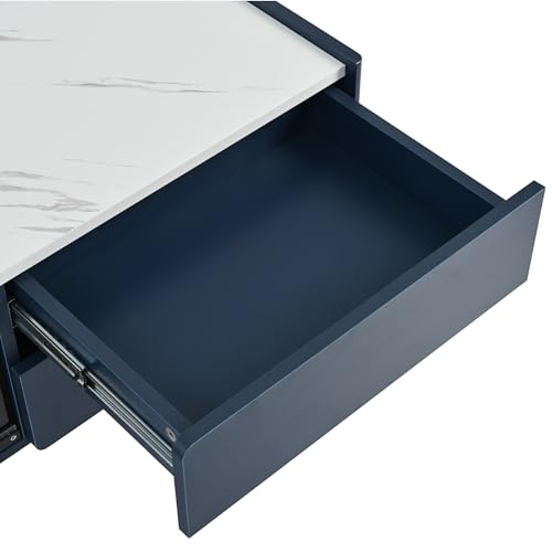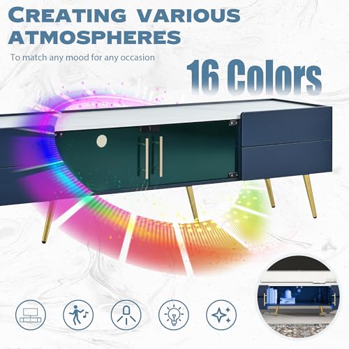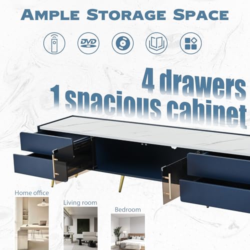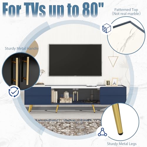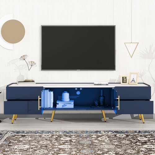 Modern TV Stand for TVs up to 80 Inches, Entertainment Center with 4 Drawers and 1 Cabinet with Brown Glass Door, Media Console with Metal Legs and Handles for Living Room (Blue-32)
