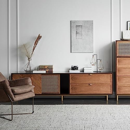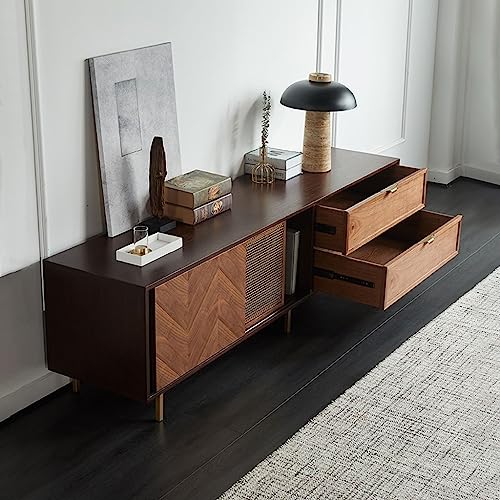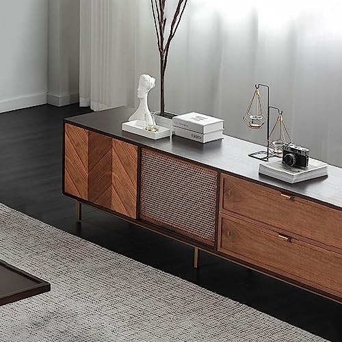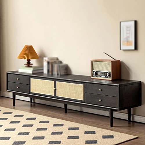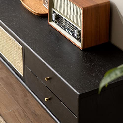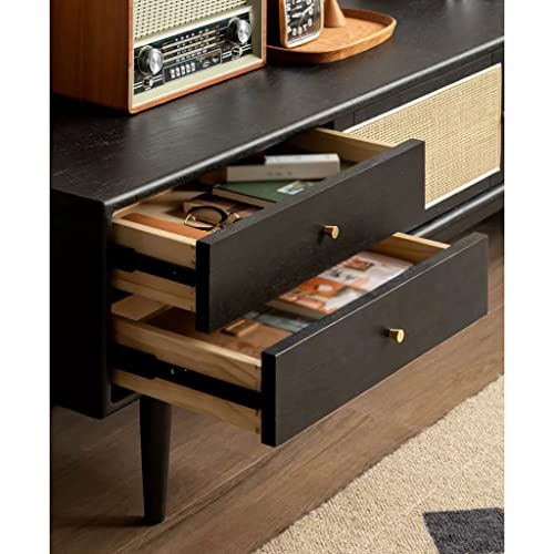 Modern TV Stand Rattan TV Cabinet Living Room Media Entertainment Center Console with 6 Storage Drawers Retro Black TV Stand Storage Cabinets(M-180cm)