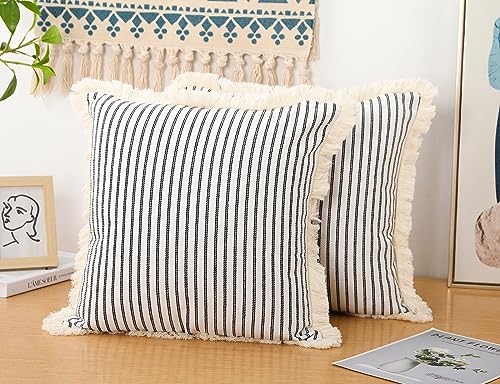 Set of 2 Light Blue Boho Throw Pillow Covers 16 x 16,Cotton Neutral Pillow with Tassel Fringe,Decorative Pillow Cover Pillow Case Cushion Cover for Bed Sofa Couch Farmhouse Living Room