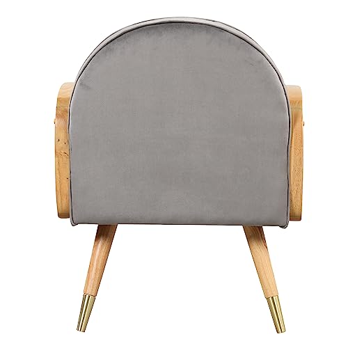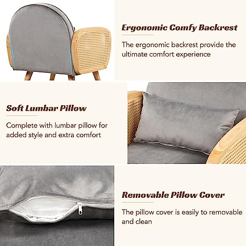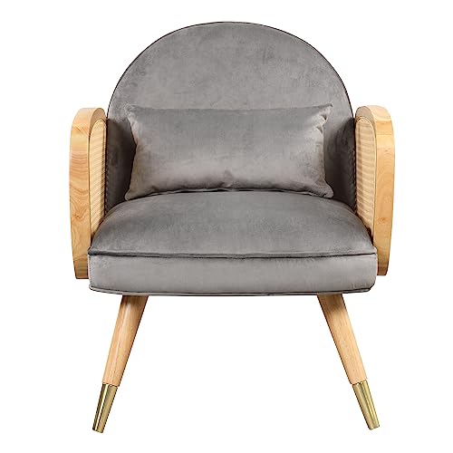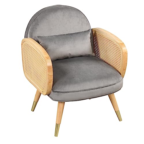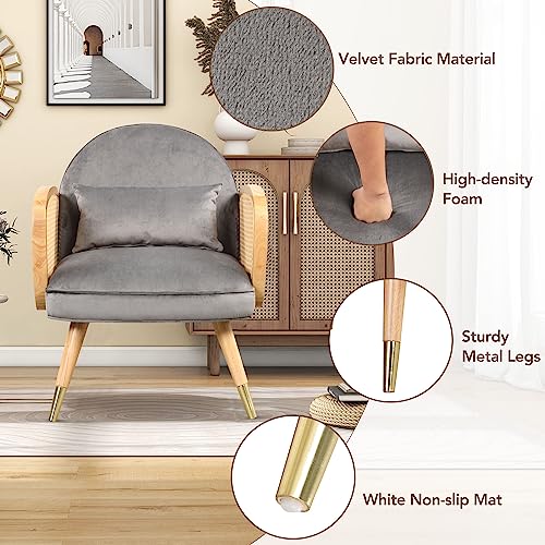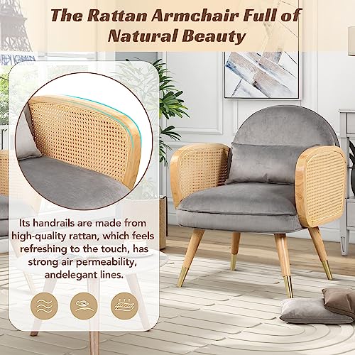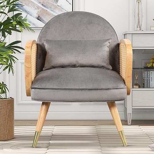 P PURLOVE Accent Chair for Living Room, Armchair with Rattan Armrest and Metal Legs, Mid Century Chairs with Backrest, Upholstered Modern Chairs for Bedroom or Reading Room, Grey