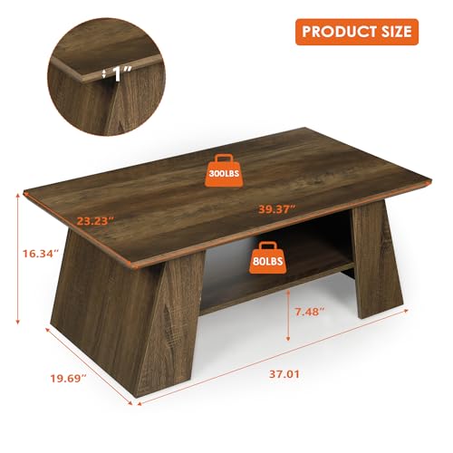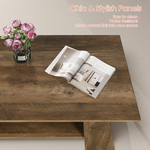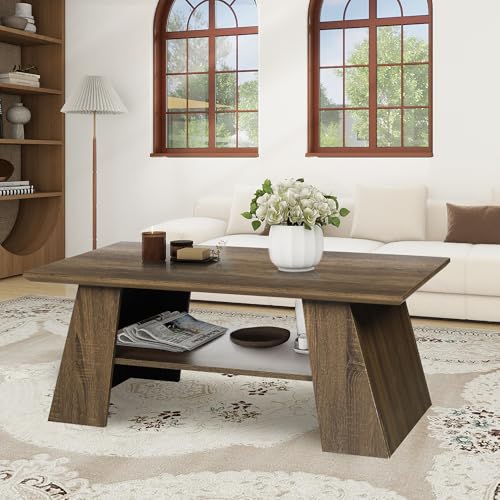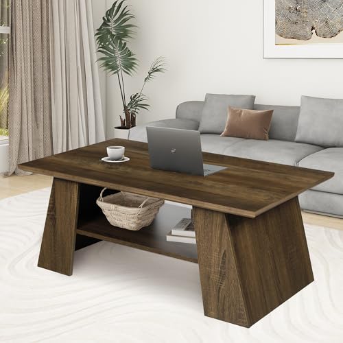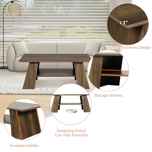 AILEEKISS Coffee Table with Storage Shelf, 2-Tier Mid Century Modern Coffee Tables, Farmhouse Wooden Center Table for Living Room, Bedroom, Office, Balcony (Black Marble & Brown)