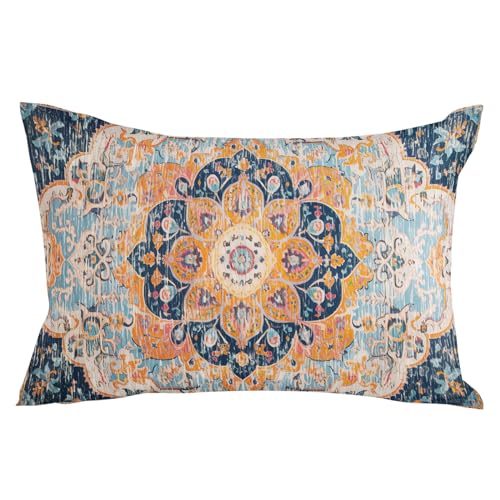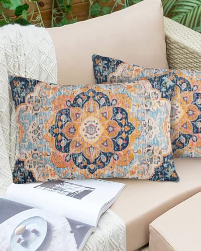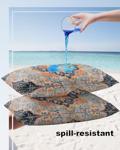 Outdoor Waterproof Throw Pillow Covers Set of 2, Pink Orange Blue Floral Textured Boho Oriental Vintage 18x18 Inch Cushion Pillow Cases Patio Outside Decor for Couch, Garden Furniture
