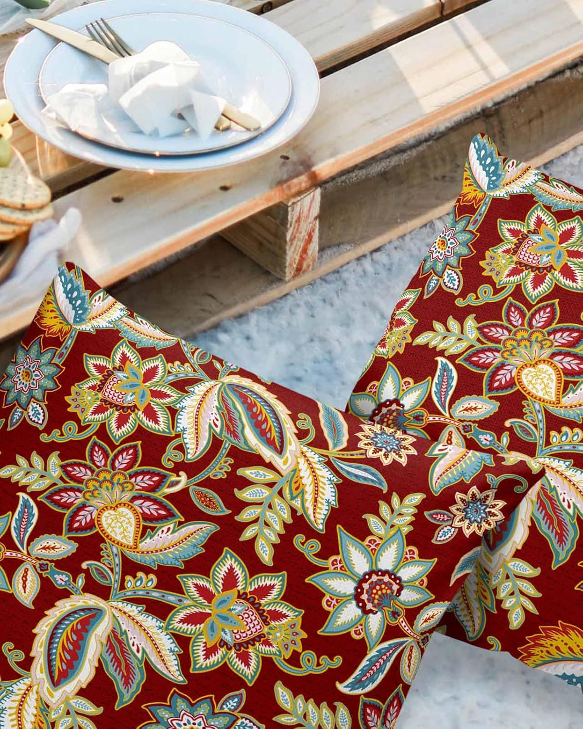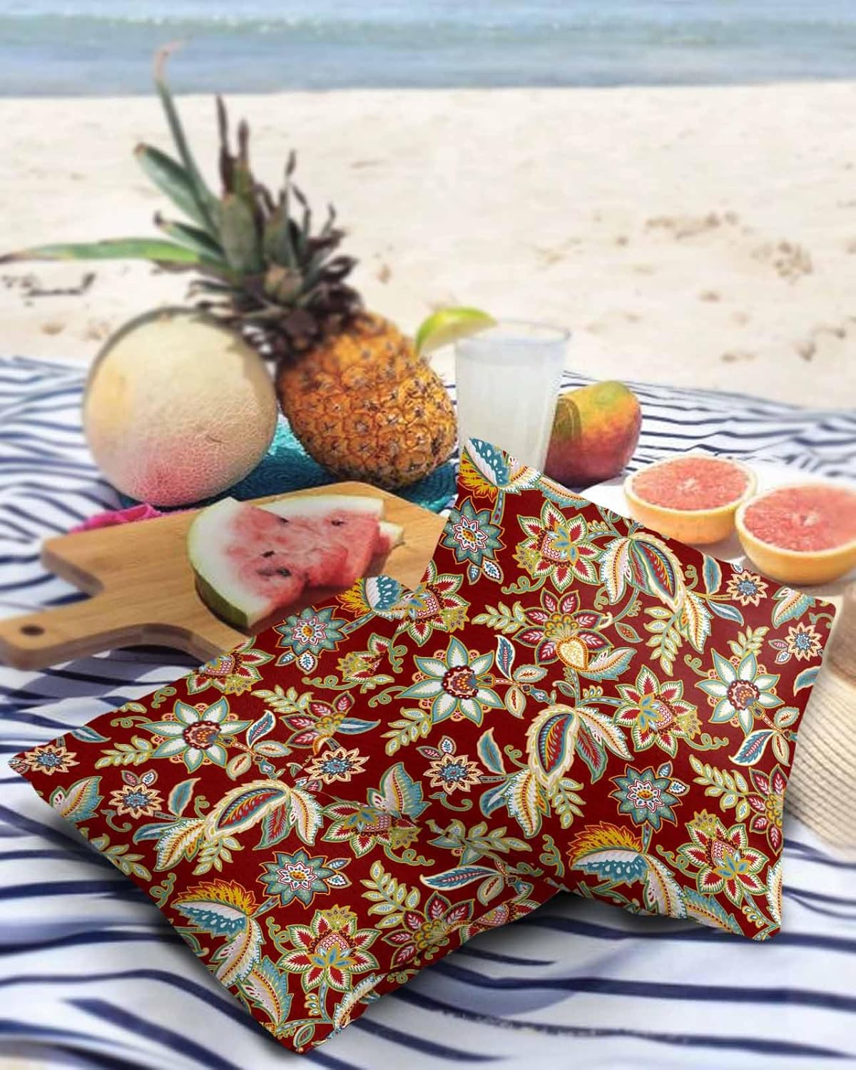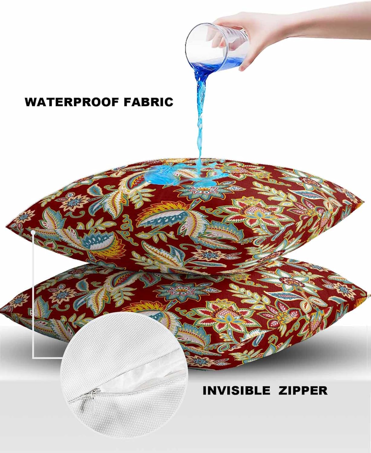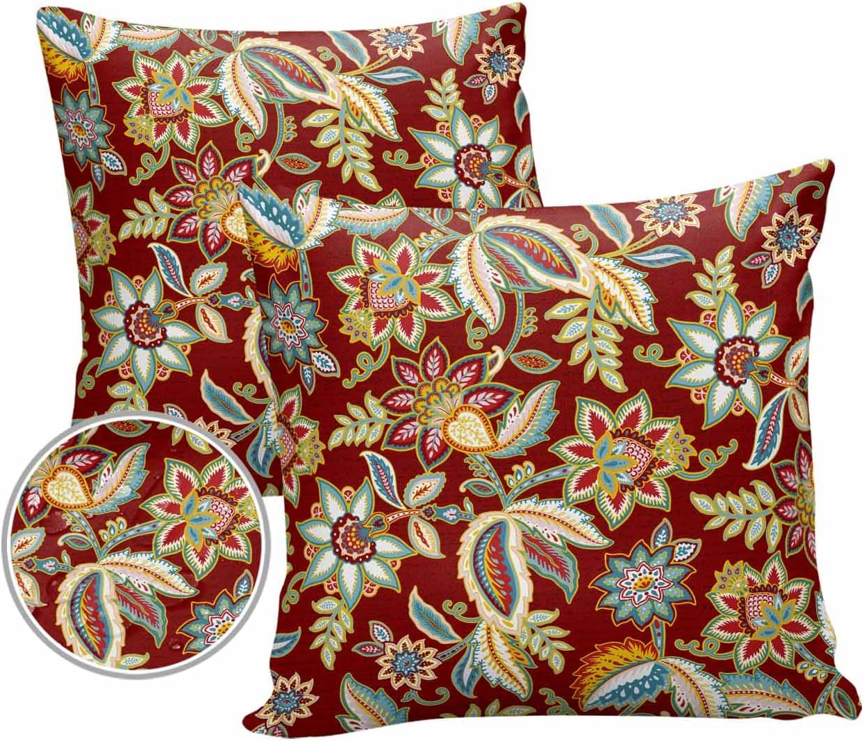 Outdoor Waterproof Throw Pillow Covers 24x24in, Paisley Pattern Cushions for Garden Patio Furniture Chairs Set of 2, Vintage Floral Red Yellow Home Decor Couch Sofa Polyester Pillow cases