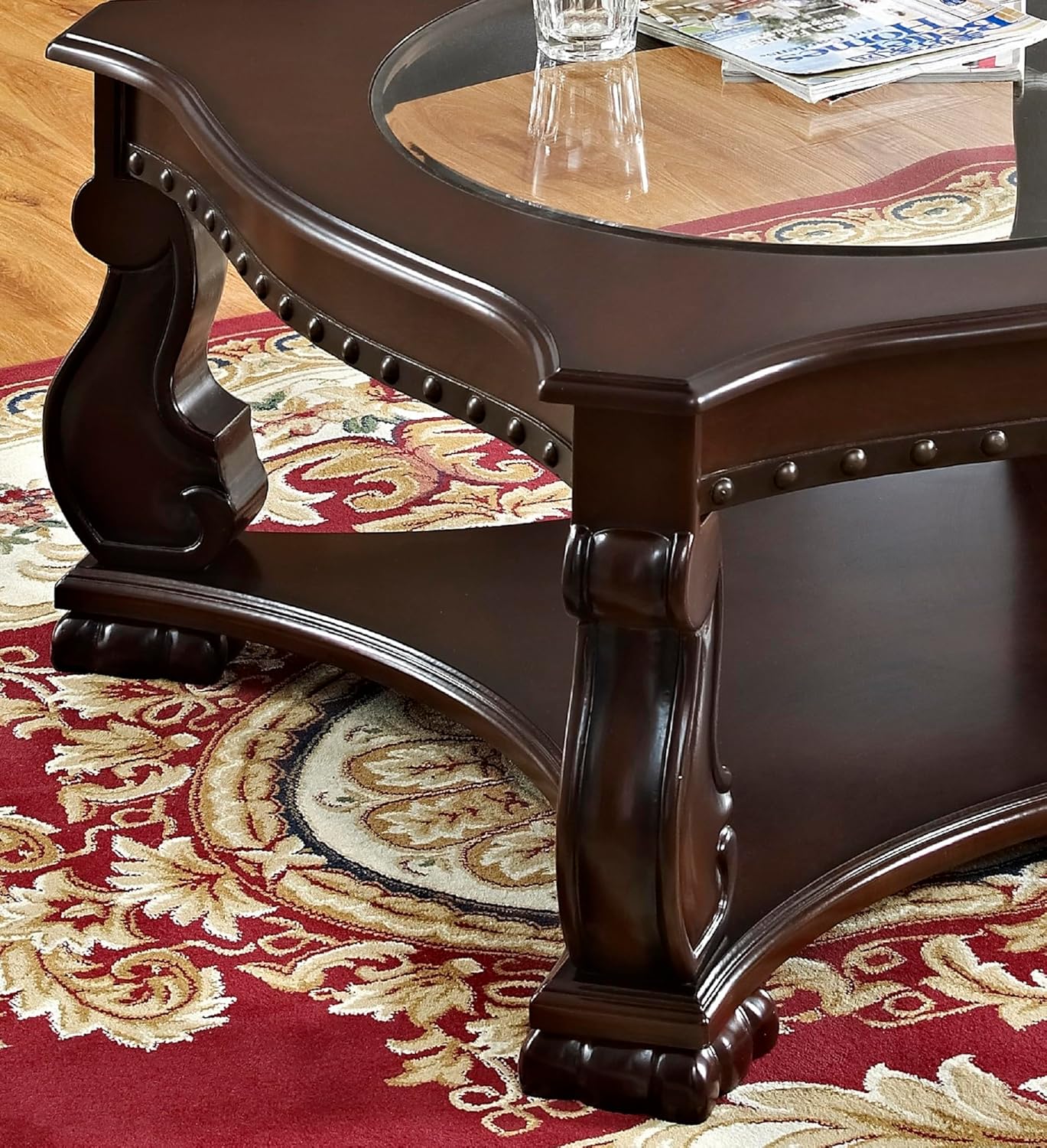 Glass Top Coffee Table Brown Base Lower Display Shelf Ornate and Sweeping Legs 1pc Formal Luxury Coffee Table