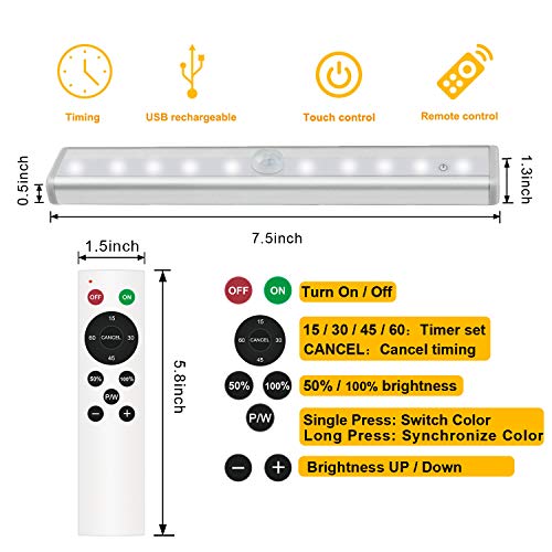 Remote Control Under Cabinet Lighting Wireless 6 Pack, 20-LED Dimmable Closet Lights Rechargeable Under Counter Light, Stick on Touch Night Light Strip Bar for Kitchen Stairway Bedroom, 3 Colors