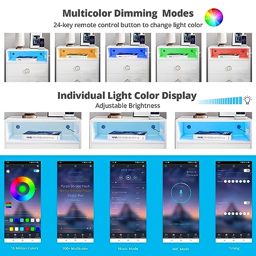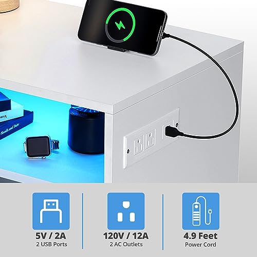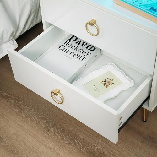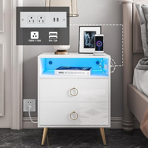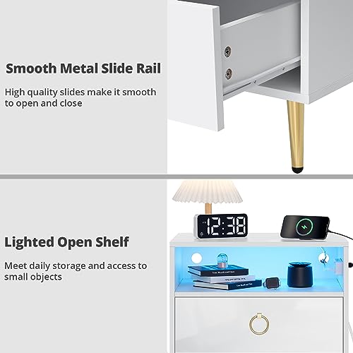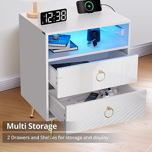 HOMMPA White LED Nightstand with Charging Station Open Shelf Bedside Table with 2 Drawers with Smart Nightstand with USB Ports High Gloss Night Stand for Bedroom with 16 Colors LED Light