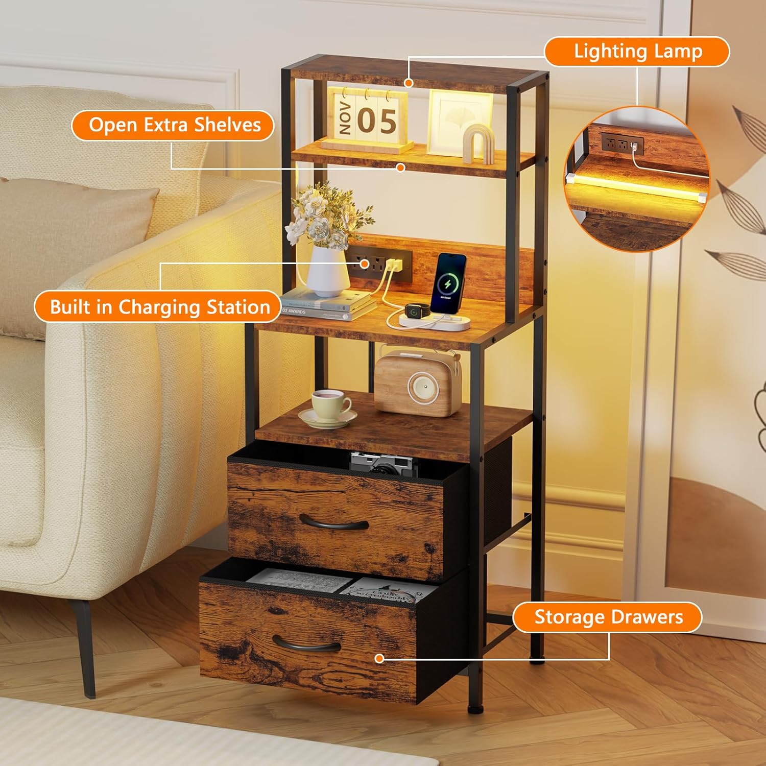 Furnulem 39inch Tall Nightstand with 2 Drawers and Charging Station,End Table with Wooden Shelf, Side Table with USB Ports and Outlets for Bedroom, Entryway, Rustic Brown