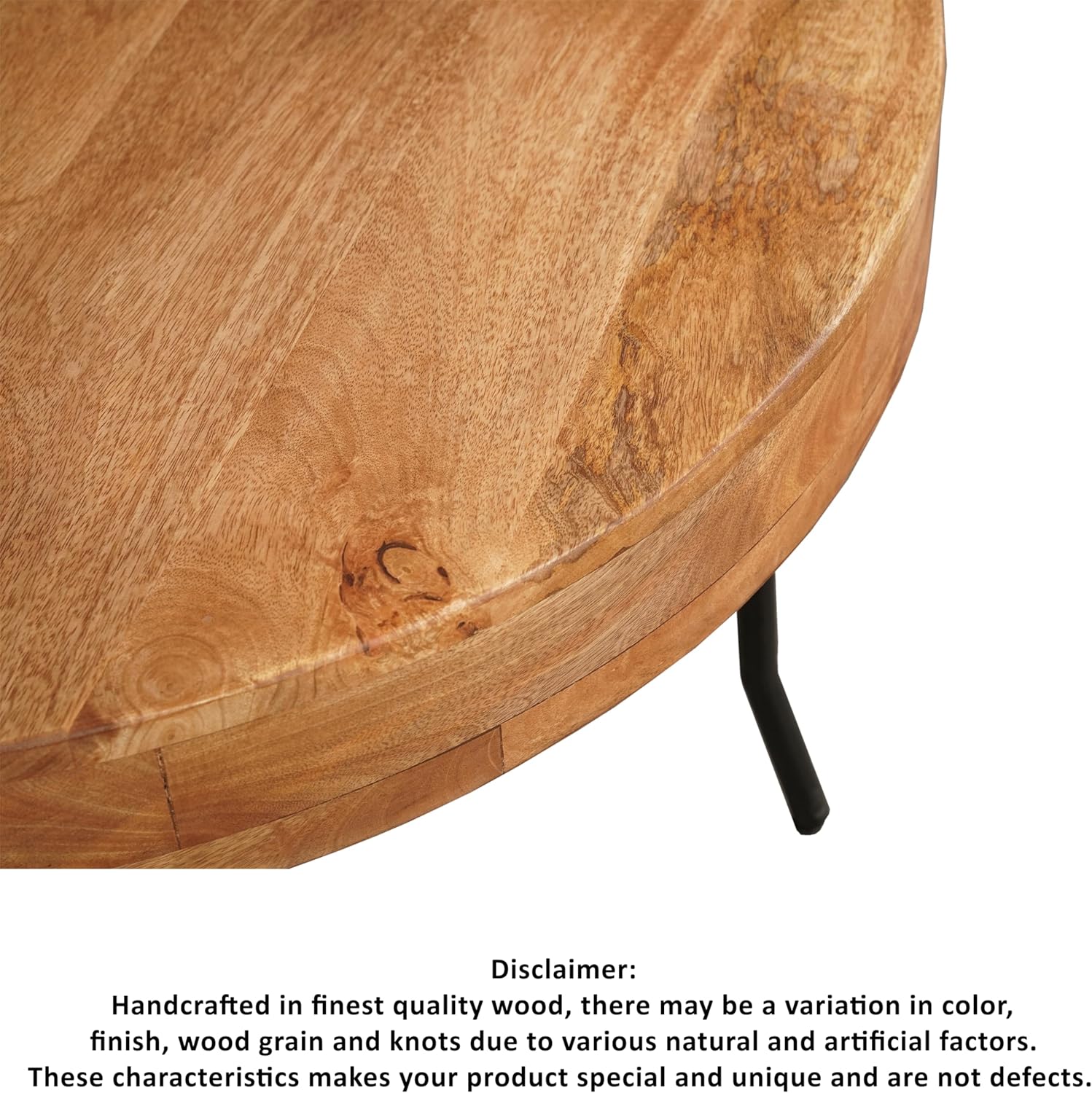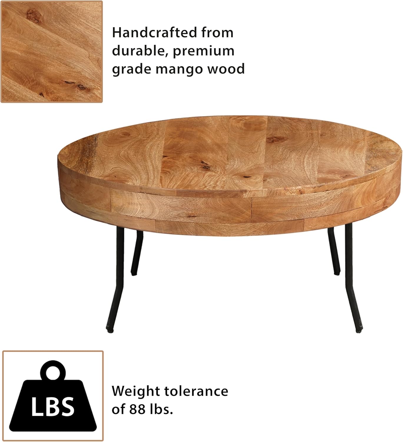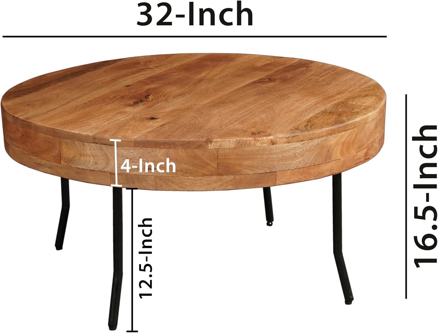32 Inch Coffee Table, Handcrafted Mango Wood Round Top, Black Metal Angled Legs,Living Room Table Modern Funiture Table