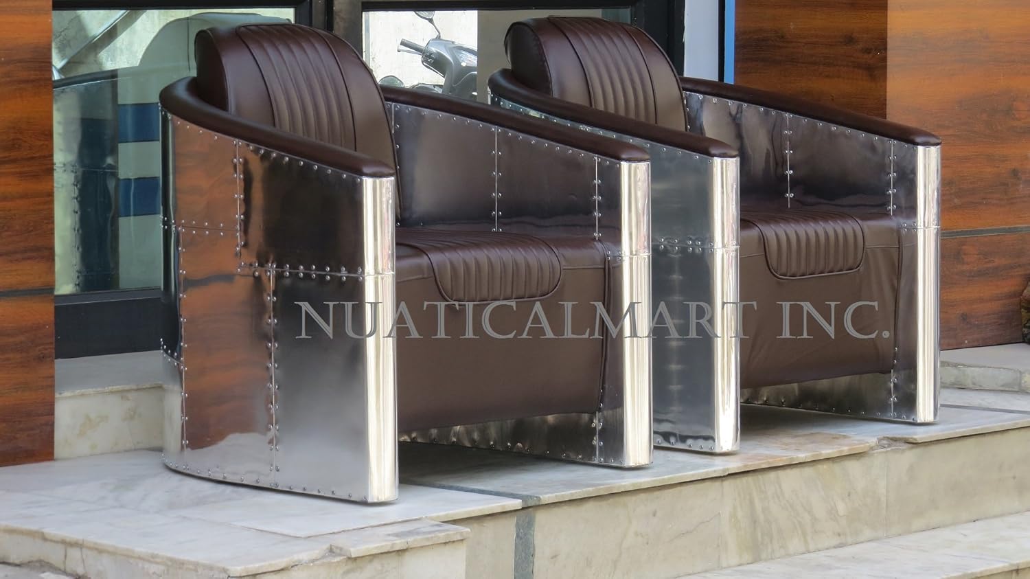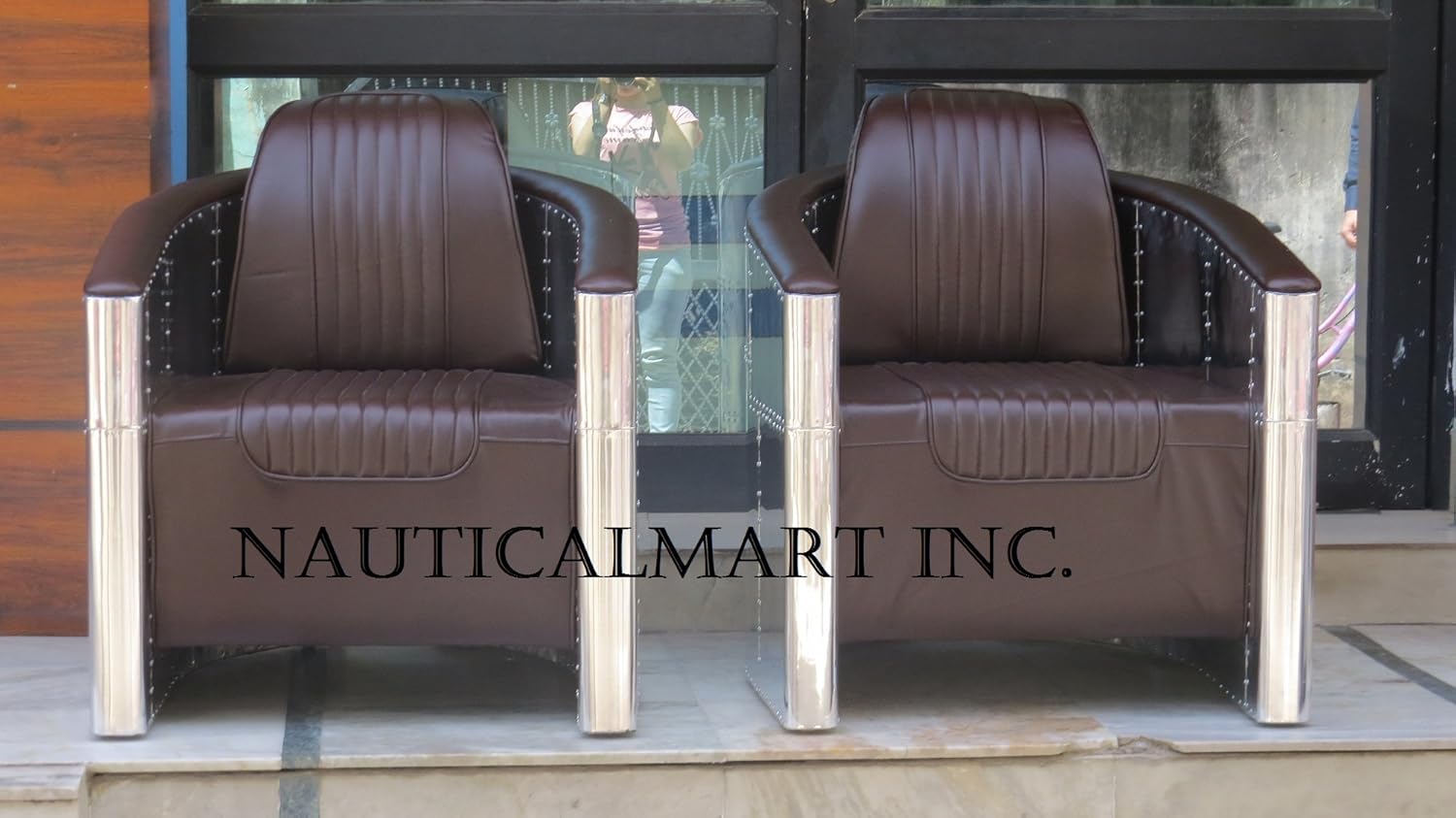NauticalMart Vintage Look Brown Leather Aluminum Chair Set of Two