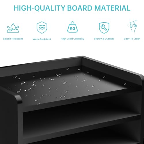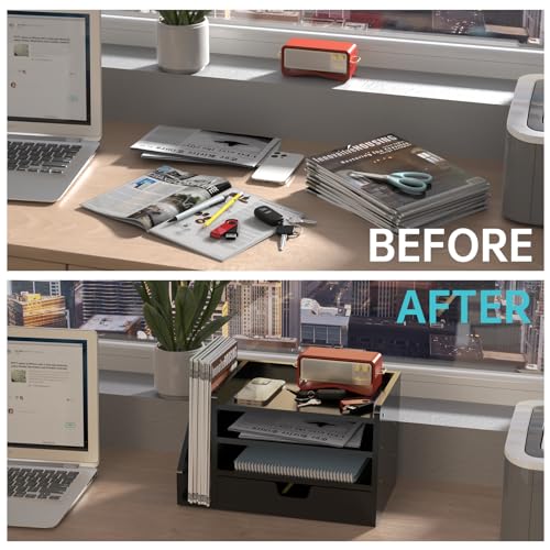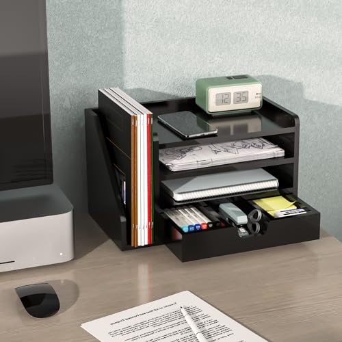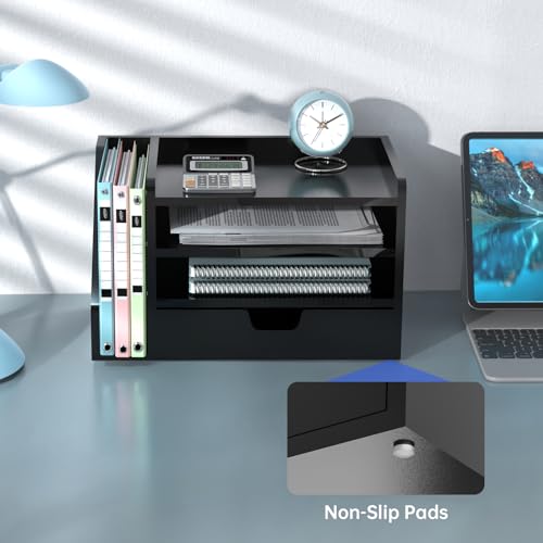 Multi-Tier Wood Desk File Organizer with Side File Rack, 3 Tray Shelves & Adjustable Drawer - Space-Efficient Design Easy to Assemble for Efficient Office Setup, Reduces Desk Clutter (Black)