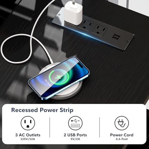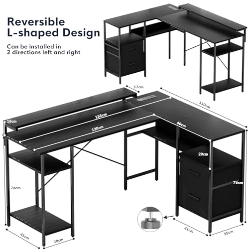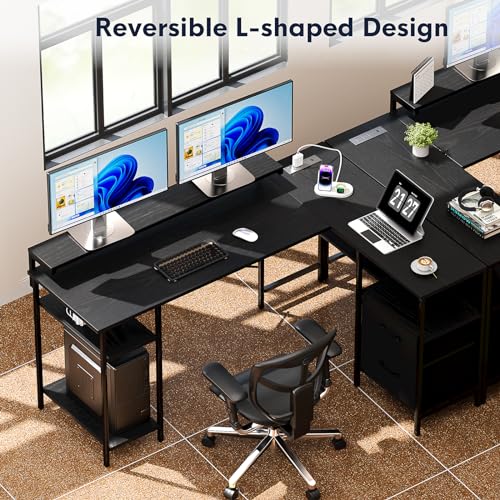 L-Shaped Home Office Desks with 2 Drawers Reversible Computer Gaming Desk with Monitor Stand Power Outlets Corner Desks for Home Office 61" Pure Black