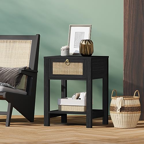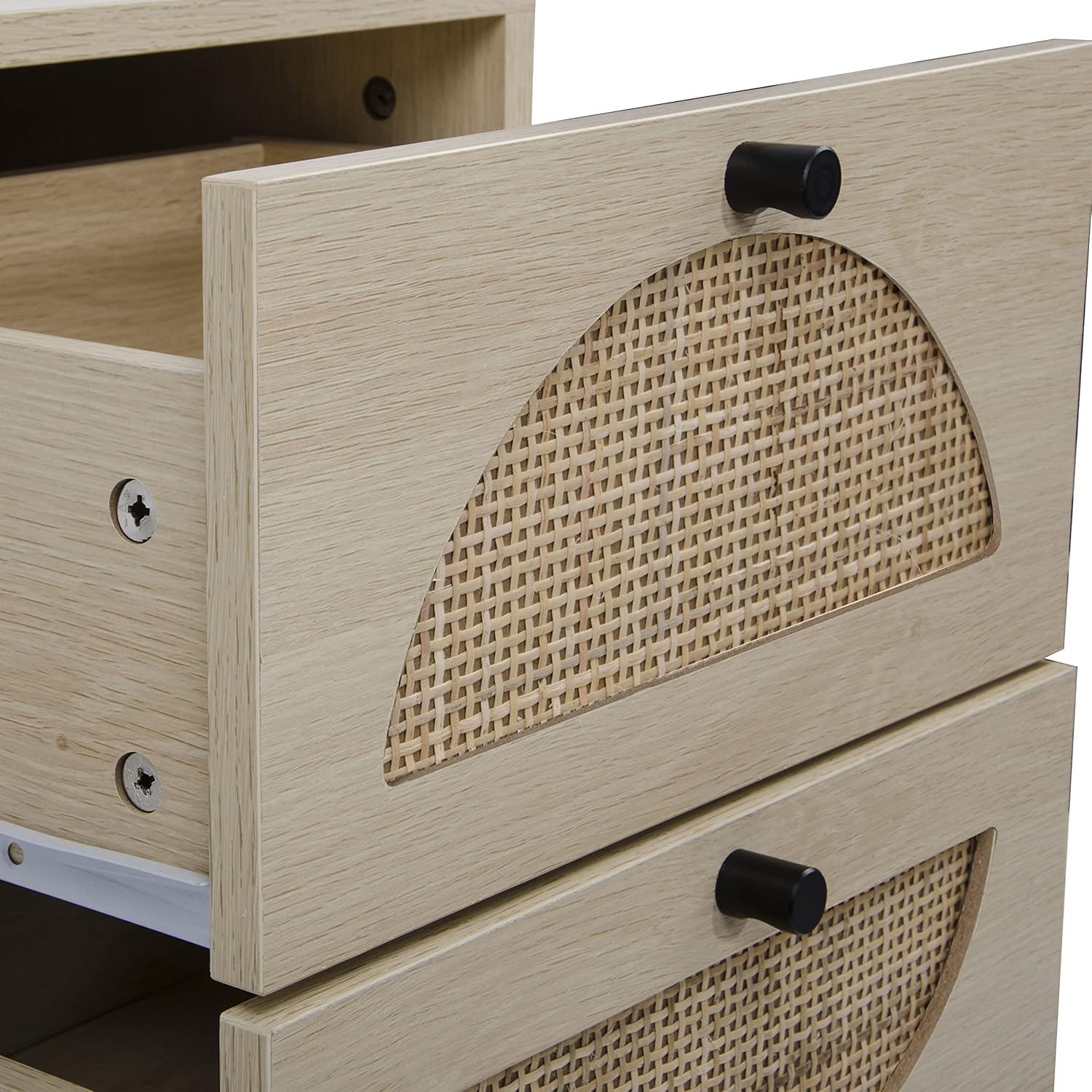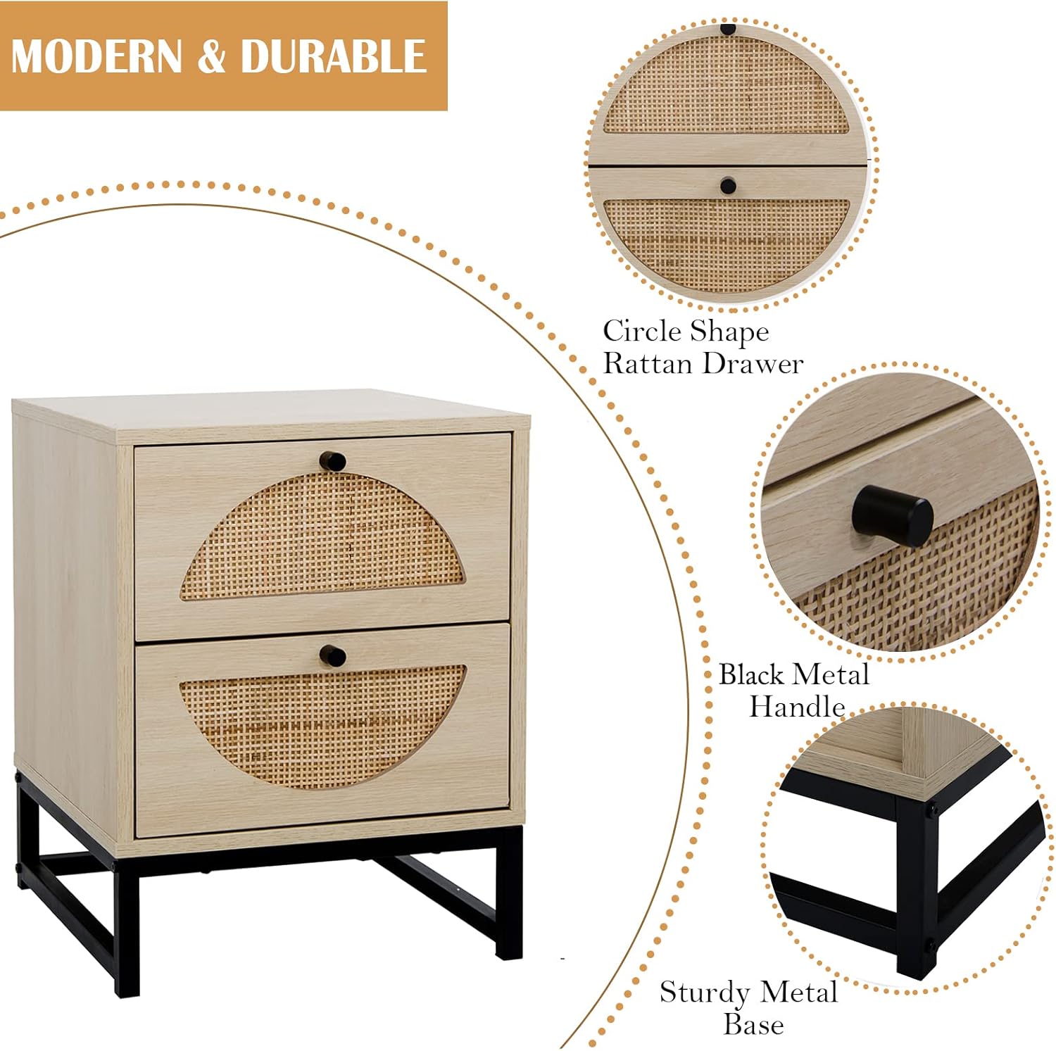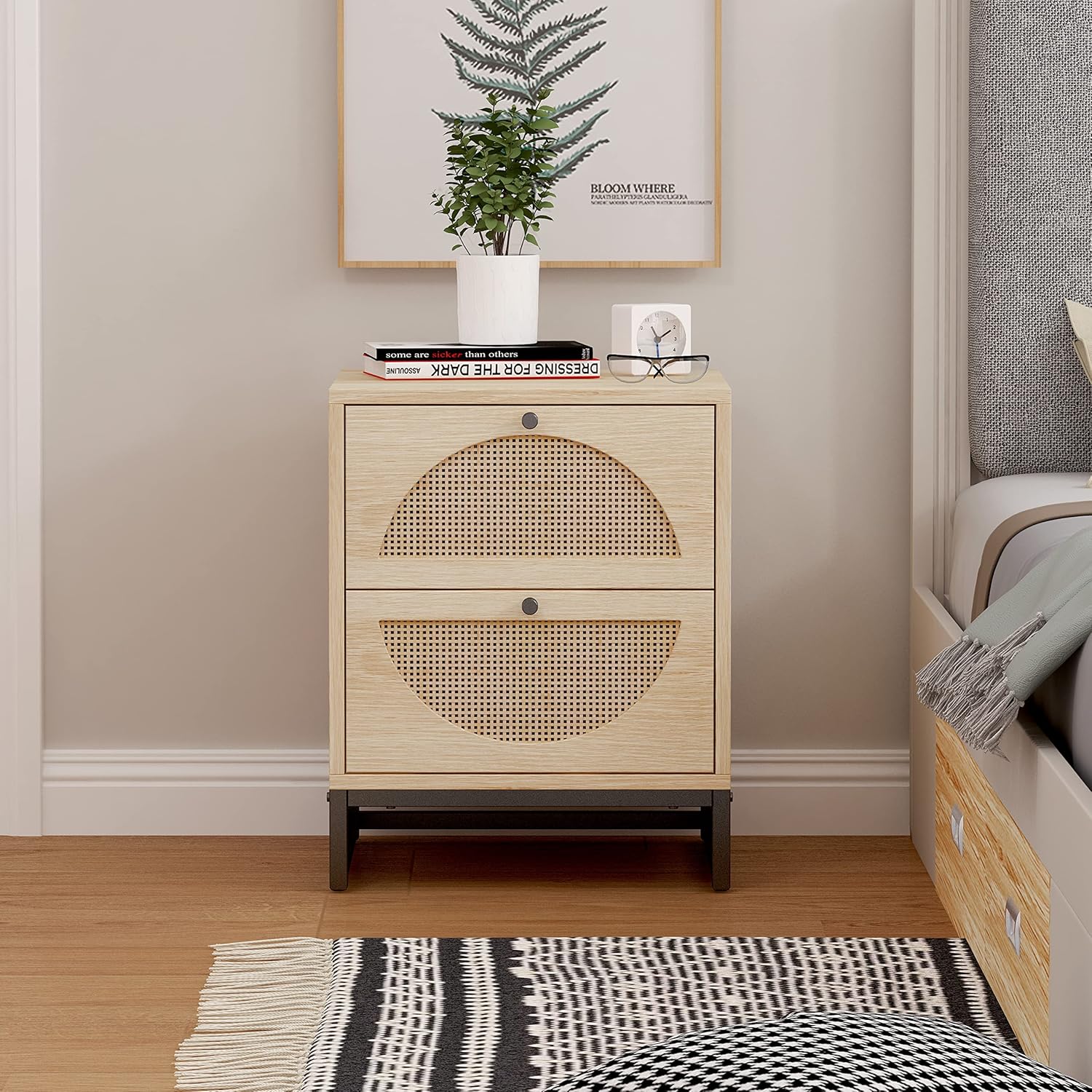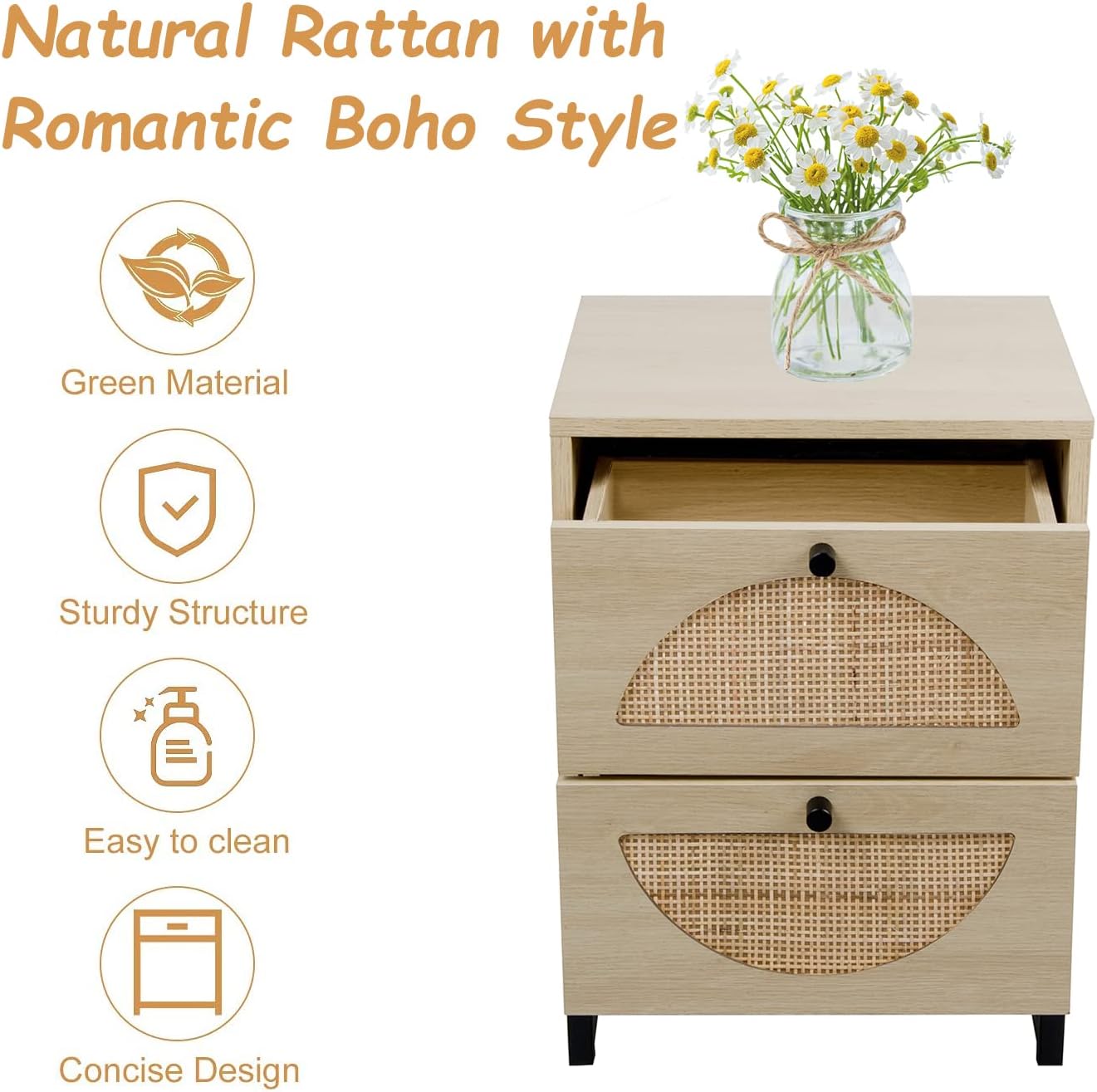 Modern Natural Nightstand with 2 Drawers Rattan Side Table End Table with Storage Elegant Wood Square Bedside Table for Bedroom Living Room Small Space(1 pack